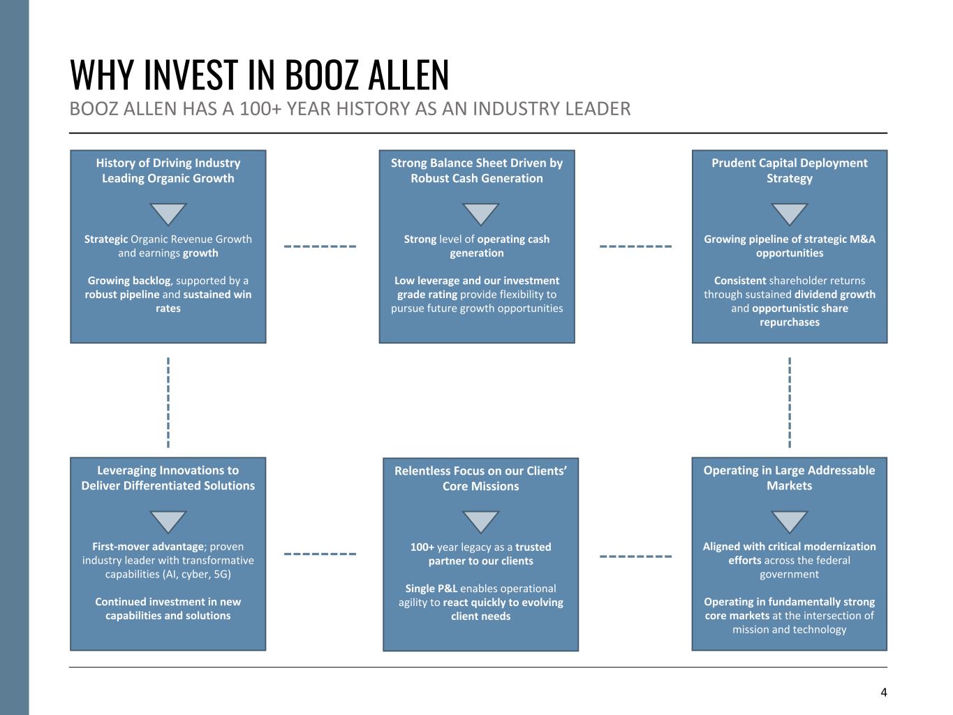 3 20171966 COMPANY HISTORY OUR HERITAGE IS AT THE CORE OF EVERYTHING WE DO 1914 Booz Allen founded in 1914 by Edwin Booz in Chicago With over 100 years of industry leadership, Booz Allen is one of the most respected names in government contracting Hired to help U.S. Navy prepare for WWII Spun off commercial consulting business; Carlyle became majority shareholder Acquired Aquilent, Inc., a digital services business Launched Vision 2020 Strategy—transforming the company from a consulting firm to leading solutions provider 1940 2010 2013 2016 2017 Initial Public Offering Acquired Defense Systems Engineering & Support 2008 Carlyle completed ownership exit Acquired Liberty IT Solutions Awarded $1.1B BID contract by the VA Acquired Tracepoint Holdings Launched VoLT– new firmwide growth strategy 2021 Acquired EverWatch Corporation Divested MENA management consulting business and Managed Threat Services (MTS) business Awarded $1.5B eMAPS2 contract—single largest TO in Company’s history 2022 2023 Awarded $1.9B Thunderdome contract