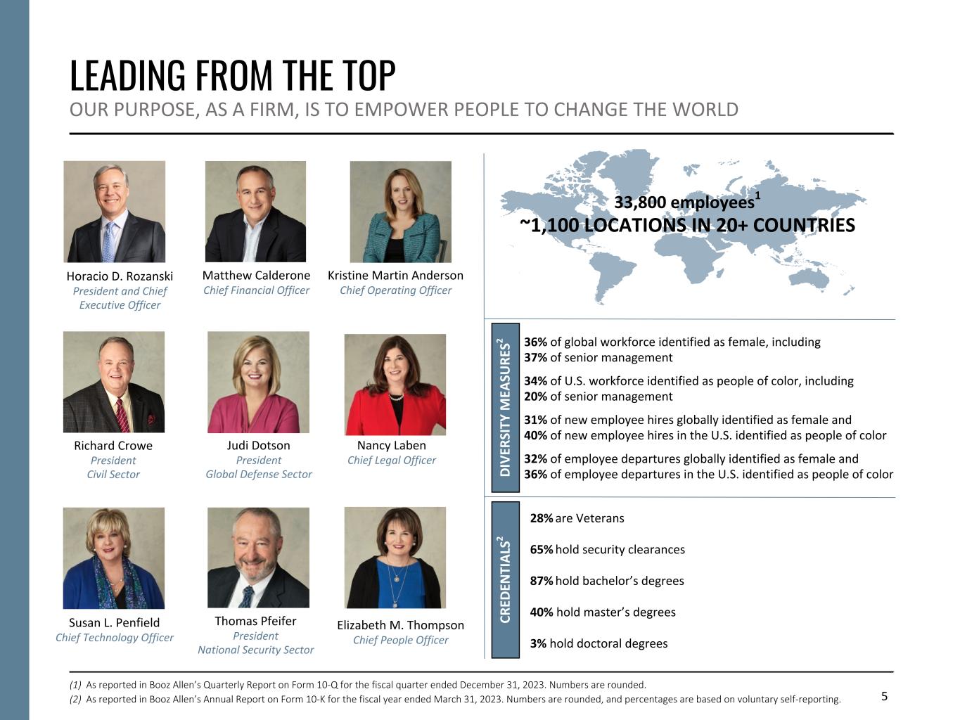 5 LEADING FROM THE TOP OUR PURPOSE, AS A FIRM, IS TO EMPOWER PEOPLE TO CHANGE THE WORLD 33,800 employees1 ~1,100 LOCATIONS IN 20+ COUNTRIES 28% are Veterans 65% hold security clearances 87% hold bachelor’s degrees 40% hold master’s degrees 3% hold doctoral degrees D IV ER SI TY M EA SU RE S2 CR ED EN TI A LS 2 36% of global workforce identified as female, including 37% of senior management 34% of U.S. workforce identified as people of color, including 20% of senior management 31% of new employee hires globally identified as female and 40% of new employee hires in the U.S. identified as people of color 32% of employee departures globally identified as female and 36% of employee departures in the U.S. identified as people of color Horacio D. Rozanski President and Chief Executive Officer Matthew Calderone Chief Financial Officer Kristine Martin Anderson Chief Operating Officer Elizabeth M. Thompson Chief People Officer Thomas Pfeifer President National Security Sector Judi Dotson President Global Defense Sector Richard Crowe President Civil Sector Nancy Laben Chief Legal Officer Susan L. Penfield Chief Technology Officer (1) As reported in Booz Allen’s Quarterly Report on Form 10-Q for the fiscal quarter ended December 31, 2023. Numbers are rounded. (2) As reported in Booz Allen’s Annual Report on Form 10-K for the fiscal year ended March 31, 2023. Numbers are rounded, and percentages are based on voluntary self-reporting.