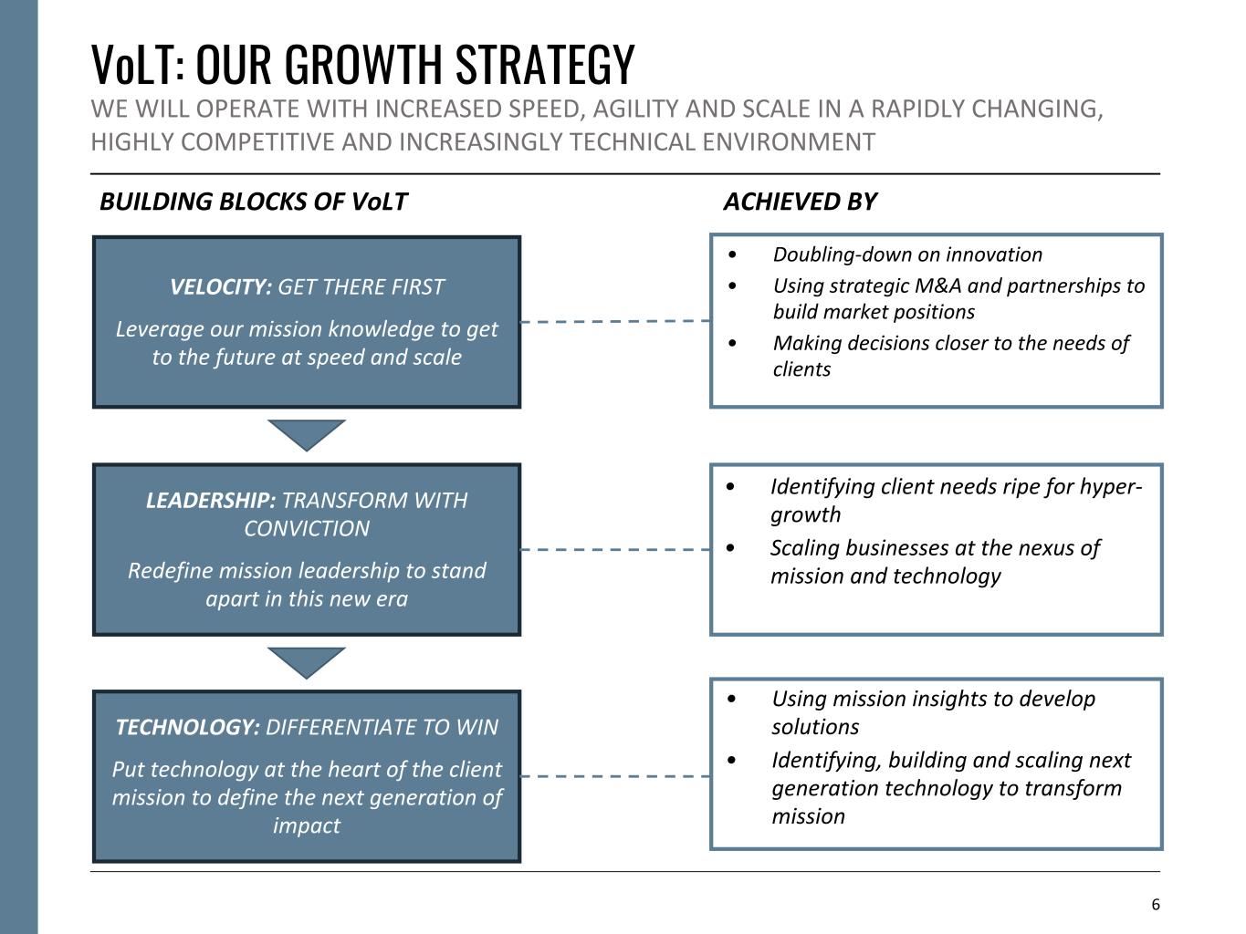 VoLT: OUR GROWTH STRATEGY WE WILL OPERATE WITH INCREASED SPEED, AGILITY AND SCALE IN A RAPIDLY CHANGING, HIGHLY COMPETITIVE AND INCREASINGLY TECHNICAL ENVIRONMENT 6 BUILDING BLOCKS OF VoLT ACHIEVED BY • Doubling-down on innovation • Using strategic M&A and partnerships to build market positions • Making decisions closer to the needs of clients VELOCITY: GET THERE FIRST Leverage our mission knowledge to get to the future at speed and scale LEADERSHIP: TRANSFORM WITH CONVICTION Redefine mission leadership to stand apart in this new era TECHNOLOGY: DIFFERENTIATE TO WIN Put technology at the heart of the client mission to define the next generation of impact • Identifying client needs ripe for hyper- growth • Scaling businesses at the nexus of mission and technology • Using mission insights to develop solutions • Identifying, building and scaling next generation technology to transform mission