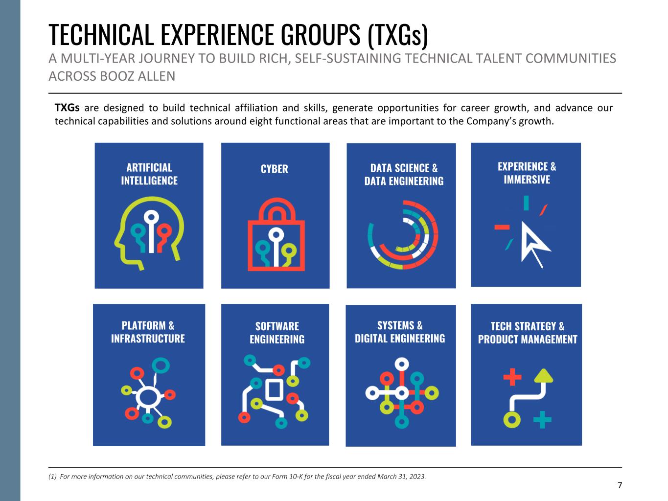 7 Justin Neroda (CTO) Scott Jachimski (GDS) PLATFORM & INFRASTRUCTURE Raynor Dahlquist (NSS) Jandria Alexander (GDS) Saurin Shah (NSS) Craig Swanson (CS) Santiago Milan (CS) Cameron Mayer (GDS) Dan Tucker (CS) Dave Gagliano (GDC) Brian Zimmerman (GDS) Adam Weiner (GDS) Osama Malik (CS) Brian MacCarthy (CTO) ARTIFICIAL INTELLIGENCE CYBER DATA SCIENCE & DATA ENGINEERING EXPERIENCE & IMMERSIVE PLATFORM & INFRASTRUCTURE SOFTWARE ENGINEERING SYSTEMS & DIGITAL ENGINEERING TECH STRATEGY & PRODUCT MANAGEMENT TECHNICAL EXPERIENCE GROUPS (TXGs) A MULTI-YEAR JOURNEY TO BUILD RICH, SELF-SUSTAINING TECHNICAL TALENT COMMUNITIES ACROSS BOOZ ALLEN (1) For more information on our technical communities, please refer to our Form 10-K for the fiscal year ended March 31, 2023. TXGs are designed to build technical affiliation and skills, generate opportunities for career growth, and advance our technical capabilities and solutions around eight functional areas that are important to the Company’s growth.