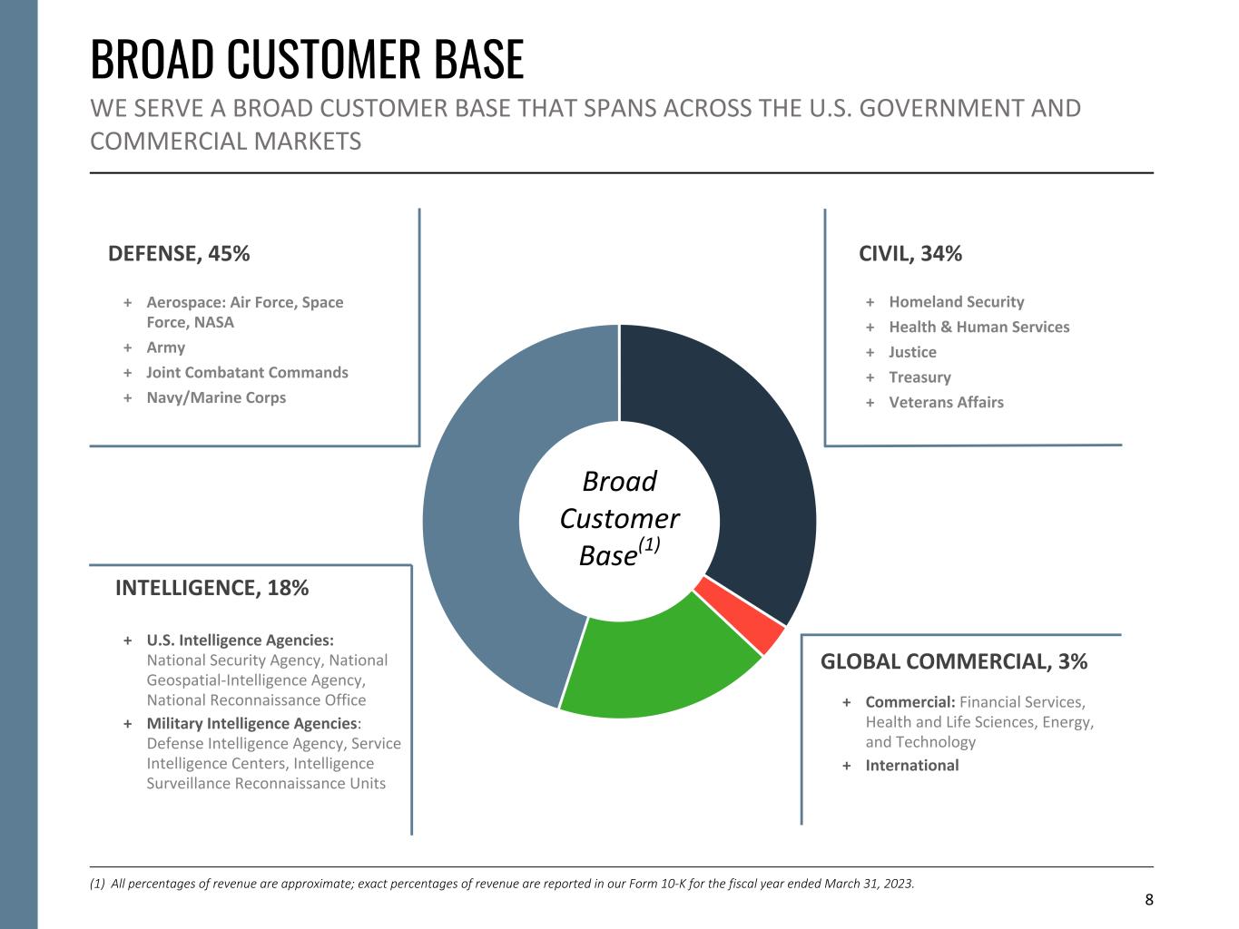 BROAD CUSTOMER BASE WE SERVE A BROAD CUSTOMER BASE THAT SPANS ACROSS THE U.S. GOVERNMENT AND COMMERCIAL MARKETS 8 + Commercial: Financial Services, Health and Life Sciences, Energy, and Technology + International GLOBAL COMMERCIAL, 3% + U.S. Intelligence Agencies: National Security Agency, National Geospatial-Intelligence Agency, National Reconnaissance Office + Military Intelligence Agencies: Defense Intelligence Agency, Service Intelligence Centers, Intelligence Surveillance Reconnaissance Units INTELLIGENCE, 18% + Aerospace: Air Force, Space Force, NASA + Army + Joint Combatant Commands + Navy/Marine Corps DEFENSE, 45% CIVIL, 34% + Homeland Security + Health & Human Services + Justice + Treasury + Veterans Affairs (1) All percentages of revenue are approximate; exact percentages of revenue are reported in our Form 10-K for the fiscal year ended March 31, 2023. Broad Customer Base(1)