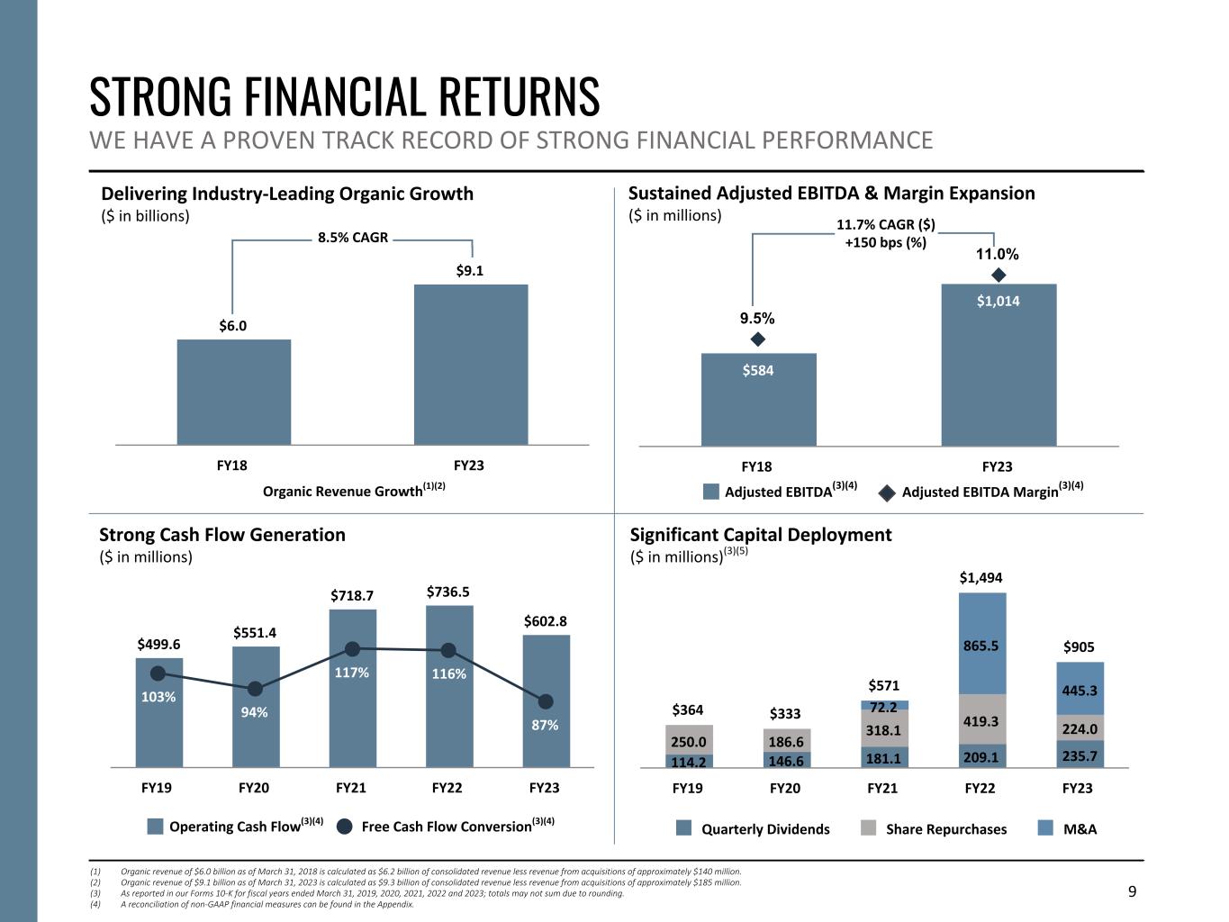 9 STRONG FINANCIAL RETURNS WE HAVE A PROVEN TRACK RECORD OF STRONG FINANCIAL PERFORMANCE Delivering Industry-Leading Organic Growth ($ in billions) Sustained Adjusted EBITDA & Margin Expansion ($ in millions) Organic Revenue Growth(1)(2) Strong Cash Flow Generation ($ in millions) Significant Capital Deployment ($ in millions)(3)(5) (1) Organic revenue of $6.0 billion as of March 31, 2018 is calculated as $6.2 billion of consolidated revenue less revenue from acquisitions of approximately $140 million. (2) Organic revenue of $9.1 billion as of March 31, 2023 is calculated as $9.3 billion of consolidated revenue less revenue from acquisitions of approximately $185 million. (3) As reported in our Forms 10-K for fiscal years ended March 31, 2019, 2020, 2021, 2022 and 2023; totals may not sum due to rounding. (4) A reconciliation of non-GAAP financial measures can be found in the Appendix. 11.7% CAGR ($) +150 bps (%) Adjusted EBITDA(3)(4) Adjusted EBITDA Margin(3)(4) Operating Cash Flow(3)(4) Free Cash Flow Conversion(3)(4) $364 $333 $571 $1,494 $905 114.2 146.6 181.1 209.1 235.7 250.0 186.6 318.1 419.3 224.0 72.2 865.5 445.3 Quarterly Dividends Share Repurchases M&A FY19 FY20 FY21 FY22 FY23 $499.6 $551.4 $718.7 $736.5 $602.8 103% 94% 117% 116% 87% FY19 FY20 FY21 FY22 FY23 $6.0 $9.1 FY18 FY23 8.5% CAGR $584 $1,014 9.5% 11.0% FY18 FY23