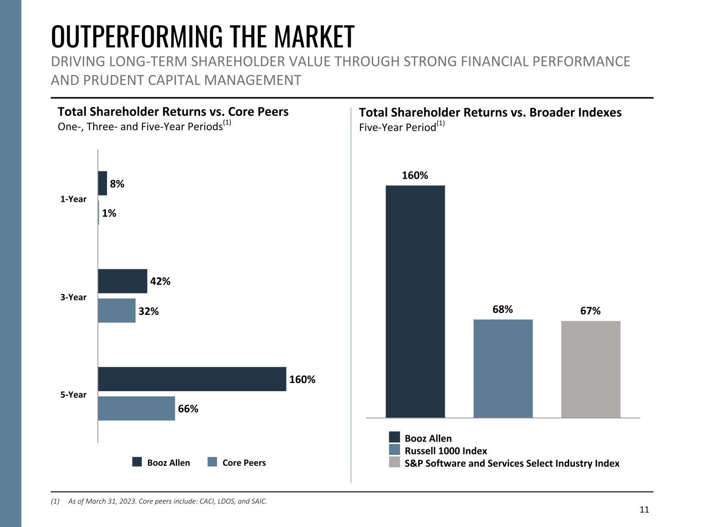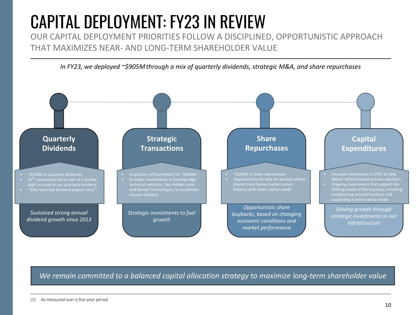 CAPITAL DEPLOYMENT: FY23 IN REVIEW OUR CAPITAL DEPLOYMENT PRIORITIES FOLLOW A DISCIPLINED, OPPORTUNISTIC APPROACH THAT MAXIMIZES NEAR- AND LONG-TERM SHAREHOLDER VALUE 10 Quarterly Dividends Sustained strong annual dividend growth since 2013 Strategic Transactions Strategic investments to fuel growth Share Repurchases Capital Expenditures • ~$236M in quarterly dividends • 10th consecutive fiscal year of a double- digit increase in our quarterly dividend • ~39% historical dividend payout ratio(1) • Acquisition of EverWatch for ~$440M • Strategic investments in leading-edge technical solutions, like Hidden Level and Reveal Technologies, to accelerate mission delivery • ~$224M in share repurchases • Opportunistically look for periods where shares trade below market value; balance with other capital needs • Focused investments in IP/IC to help deliver differentiated mission solutions • Ongoing investments that support the shifting needs of the business, including modernizing secured facilities and supporting a hybrid work model Opportunistic share buybacks, based on changing economic conditions and market performance Driving growth through strategic investments in our infrastructure We remain committed to a balanced capital allocation strategy to maximize long-term shareholder value In FY23, we deployed ~$905M through a mix of quarterly dividends, strategic M&A, and share repurchases (1) As measured over a five-year period.