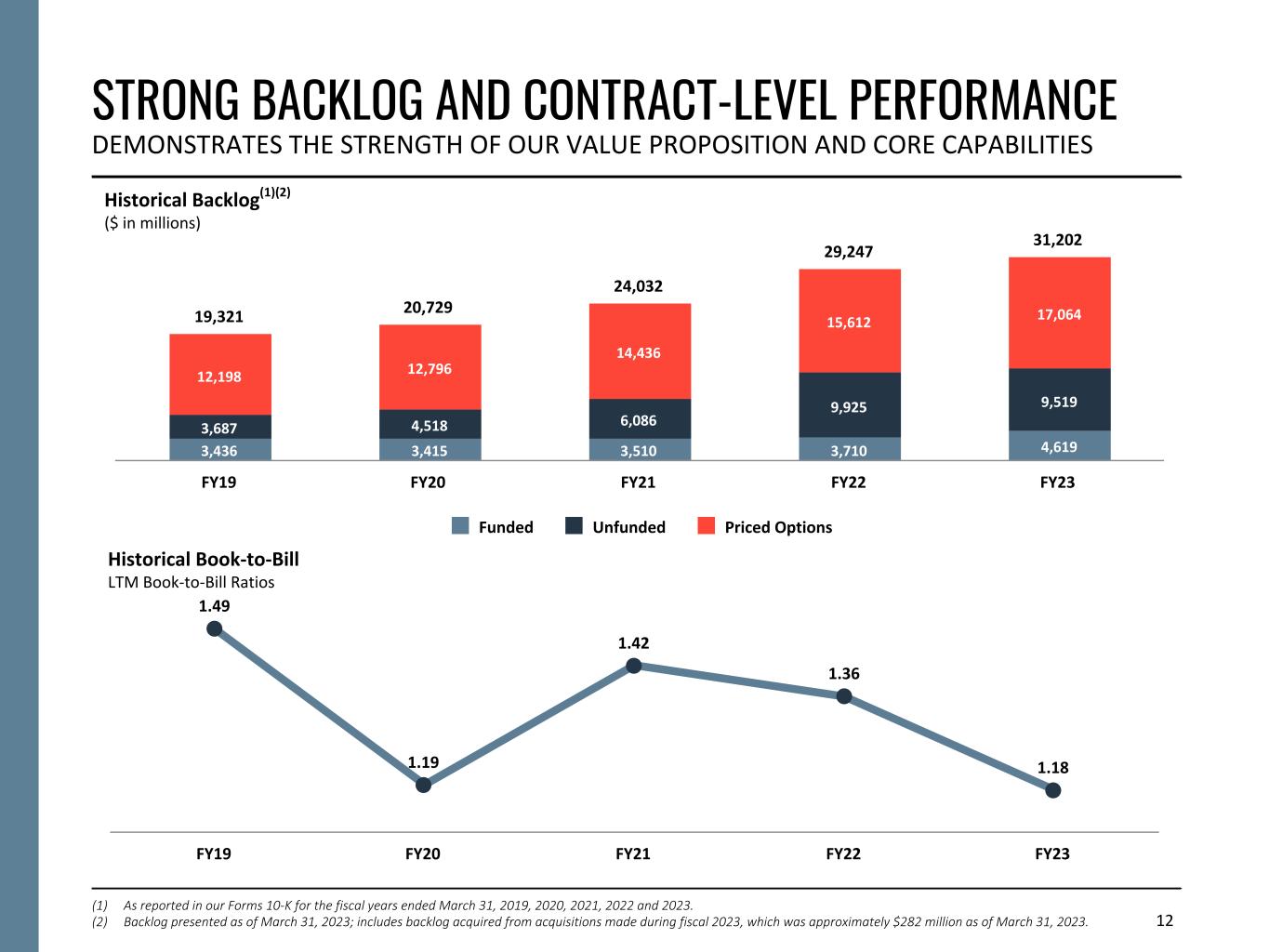 11 OUTPERFORMING THE MARKET DRIVING LONG-TERM SHAREHOLDER VALUE THROUGH STRONG FINANCIAL PERFORMANCE AND PRUDENT CAPITAL MANAGEMENT Total Shareholder Returns vs. Core Peers One-, Three- and Five-Year Periods(1) Total Shareholder Returns vs. Broader Indexes Five-Year Period(1) (1) As of March 31, 2023. Core peers include: CACI, LDOS, and SAIC. 160% 68% 67% Booz Allen Russell 1000 Index S&P Software and Services Select Industry Index 8% 42% 160% 1% 32% 66% Booz Allen Core Peers 1-Year 3-Year 5-Year