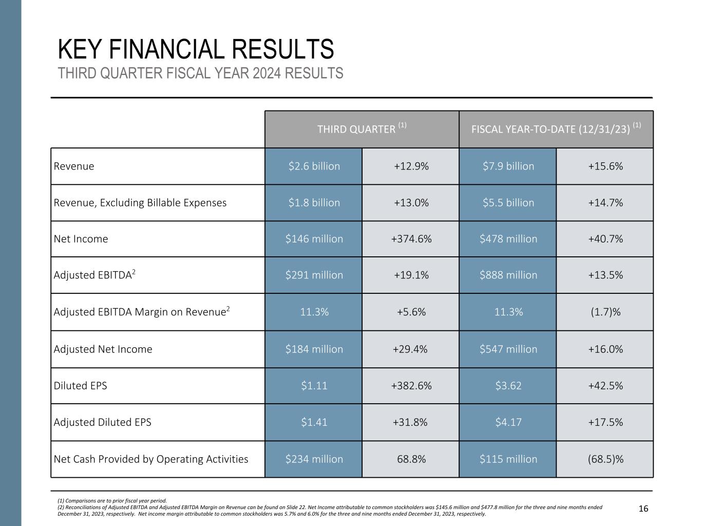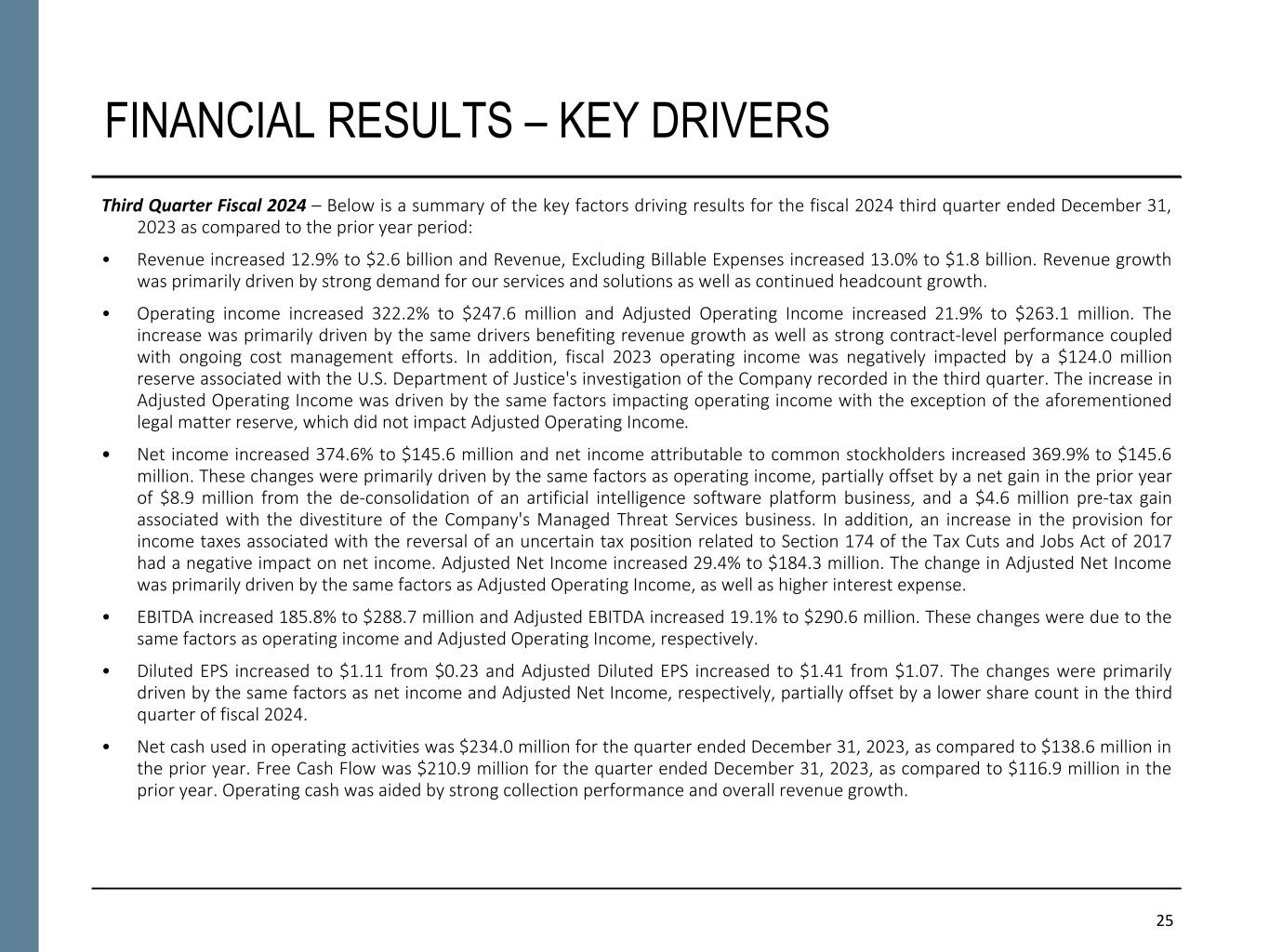 25 FINANCIAL RESULTS – KEY DRIVERS Third Quarter Fiscal 2024 – Below is a summary of the key factors driving results for the fiscal 2024 third quarter ended December 31, 2023 as compared to the prior year period: • Revenue increased 12.9% to $2.6 billion and Revenue, Excluding Billable Expenses increased 13.0% to $1.8 billion. Revenue growth was primarily driven by strong demand for our services and solutions as well as continued headcount growth. • Operating income increased 322.2% to $247.6 million and Adjusted Operating Income increased 21.9% to $263.1 million. The increase was primarily driven by the same drivers benefiting revenue growth as well as strong contract-level performance coupled with ongoing cost management efforts. In addition, fiscal 2023 operating income was negatively impacted by a $124.0 million reserve associated with the U.S. Department of Justice's investigation of the Company recorded in the third quarter. The increase in Adjusted Operating Income was driven by the same factors impacting operating income with the exception of the aforementioned legal matter reserve, which did not impact Adjusted Operating Income. • Net income increased 374.6% to $145.6 million and net income attributable to common stockholders increased 369.9% to $145.6 million. These changes were primarily driven by the same factors as operating income, partially offset by a net gain in the prior year of $8.9 million from the de-consolidation of an artificial intelligence software platform business, and a $4.6 million pre-tax gain associated with the divestiture of the Company's Managed Threat Services business. In addition, an increase in the provision for income taxes associated with the reversal of an uncertain tax position related to Section 174 of the Tax Cuts and Jobs Act of 2017 had a negative impact on net income. Adjusted Net Income increased 29.4% to $184.3 million. The change in Adjusted Net Income was primarily driven by the same factors as Adjusted Operating Income, as well as higher interest expense. • EBITDA increased 185.8% to $288.7 million and Adjusted EBITDA increased 19.1% to $290.6 million. These changes were due to the same factors as operating income and Adjusted Operating Income, respectively. • Diluted EPS increased to $1.11 from $0.23 and Adjusted Diluted EPS increased to $1.41 from $1.07. The changes were primarily driven by the same factors as net income and Adjusted Net Income, respectively, partially offset by a lower share count in the third quarter of fiscal 2024. • Net cash used in operating activities was $234.0 million for the quarter ended December 31, 2023, as compared to $138.6 million in the prior year. Free Cash Flow was $210.9 million for the quarter ended December 31, 2023, as compared to $116.9 million in the prior year. Operating cash was aided by strong collection performance and overall revenue growth.