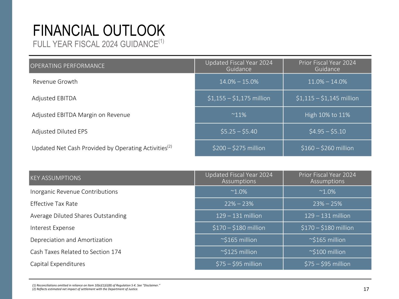17 FINANCIAL OUTLOOK FULL YEAR FISCAL 2024 GUIDANCE(1) OPERATING PERFORMANCE Updated Fiscal Year 2024 Guidance Prior Fiscal Year 2024 Guidance Revenue Growth 14.0% – 15.0% 11.0% – 14.0% Adjusted EBITDA $1,155 – $1,175 million $1,115 – $1,145 million Adjusted EBITDA Margin on Revenue ~11% High 10% to 11% Adjusted Diluted EPS $5.25 – $5.40 $4.95 – $5.10 Updated Net Cash Provided by Operating Activities(2) $200 – $275 million $160 – $260 million (1) Reconciliations omitted in reliance on Item 10(e)(1)(i)(B) of Regulation S-K. See "Disclaimer." (2) Reflects estimated net impact of settlement with the Department of Justice. KEY ASSUMPTIONS Updated Fiscal Year 2024 Assumptions Prior Fiscal Year 2024 Assumptions Inorganic Revenue Contributions ~1.0% ~1.0% Effective Tax Rate 22% – 23% 23% – 25% Average Diluted Shares Outstanding 129 – 131 million 129 – 131 million Interest Expense $170 – $180 million $170 – $180 million Depreciation and Amortization ~$165 million ~$165 million Cash Taxes Related to Section 174 ~$125 million ~$100 million Capital Expenditures $75 – $95 million $75 – $95 million