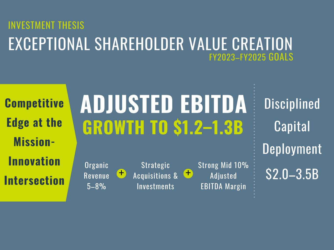 INVESTMENT THESIS EXCEPTIONAL SHAREHOLDER VALUE CREATION FY2023–FY2025 GOALS Competitive Edge at the Mission- Innovation Intersection ADJUSTED EBITDA GROWTH TO $1.2–1.3B Disciplined Capital Deployment $2.0–3.5B Organic Revenue 5–8% Strategic Acquisitions & Investments Strong Mid 10% Adjusted EBITDA Margin + +