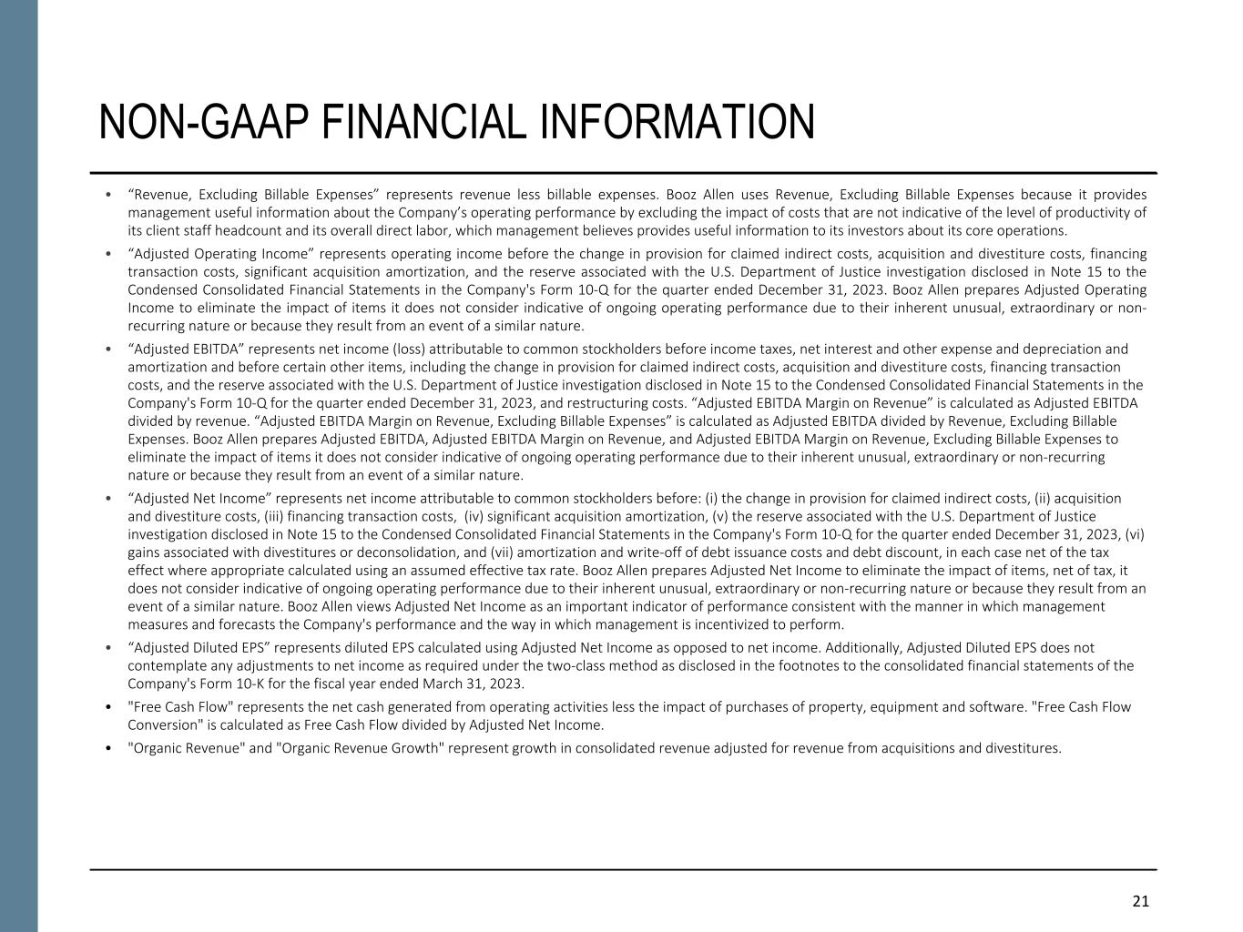 21 NON-GAAP FINANCIAL INFORMATION • “Revenue, Excluding Billable Expenses” represents revenue less billable expenses. Booz Allen uses Revenue, Excluding Billable Expenses because it provides management useful information about the Company’s operating performance by excluding the impact of costs that are not indicative of the level of productivity of its client staff headcount and its overall direct labor, which management believes provides useful information to its investors about its core operations. • “Adjusted Operating Income” represents operating income before the change in provision for claimed indirect costs, acquisition and divestiture costs, financing transaction costs, significant acquisition amortization, and the reserve associated with the U.S. Department of Justice investigation disclosed in Note 15 to the Condensed Consolidated Financial Statements in the Company's Form 10-Q for the quarter ended December 31, 2023. Booz Allen prepares Adjusted Operating Income to eliminate the impact of items it does not consider indicative of ongoing operating performance due to their inherent unusual, extraordinary or non- recurring nature or because they result from an event of a similar nature. • “Adjusted EBITDA” represents net income (loss) attributable to common stockholders before income taxes, net interest and other expense and depreciation and amortization and before certain other items, including the change in provision for claimed indirect costs, acquisition and divestiture costs, financing transaction costs, and the reserve associated with the U.S. Department of Justice investigation disclosed in Note 15 to the Condensed Consolidated Financial Statements in the Company's Form 10-Q for the quarter ended December 31, 2023, and restructuring costs. “Adjusted EBITDA Margin on Revenue” is calculated as Adjusted EBITDA divided by revenue. “Adjusted EBITDA Margin on Revenue, Excluding Billable Expenses” is calculated as Adjusted EBITDA divided by Revenue, Excluding Billable Expenses. Booz Allen prepares Adjusted EBITDA, Adjusted EBITDA Margin on Revenue, and Adjusted EBITDA Margin on Revenue, Excluding Billable Expenses to eliminate the impact of items it does not consider indicative of ongoing operating performance due to their inherent unusual, extraordinary or non-recurring nature or because they result from an event of a similar nature. • “Adjusted Net Income” represents net income attributable to common stockholders before: (i) the change in provision for claimed indirect costs, (ii) acquisition and divestiture costs, (iii) financing transaction costs, (iv) significant acquisition amortization, (v) the reserve associated with the U.S. Department of Justice investigation disclosed in Note 15 to the Condensed Consolidated Financial Statements in the Company's Form 10-Q for the quarter ended December 31, 2023, (vi) gains associated with divestitures or deconsolidation, and (vii) amortization and write-off of debt issuance costs and debt discount, in each case net of the tax effect where appropriate calculated using an assumed effective tax rate. Booz Allen prepares Adjusted Net Income to eliminate the impact of items, net of tax, it does not consider indicative of ongoing operating performance due to their inherent unusual, extraordinary or non-recurring nature or because they result from an event of a similar nature. Booz Allen views Adjusted Net Income as an important indicator of performance consistent with the manner in which management measures and forecasts the Company's performance and the way in which management is incentivized to perform. • “Adjusted Diluted EPS” represents diluted EPS calculated using Adjusted Net Income as opposed to net income. Additionally, Adjusted Diluted EPS does not contemplate any adjustments to net income as required under the two-class method as disclosed in the footnotes to the consolidated financial statements of the Company's Form 10-K for the fiscal year ended March 31, 2023. • "Free Cash Flow" represents the net cash generated from operating activities less the impact of purchases of property, equipment and software. "Free Cash Flow Conversion" is calculated as Free Cash Flow divided by Adjusted Net Income. • "Organic Revenue" and "Organic Revenue Growth" represent growth in consolidated revenue adjusted for revenue from acquisitions and divestitures.