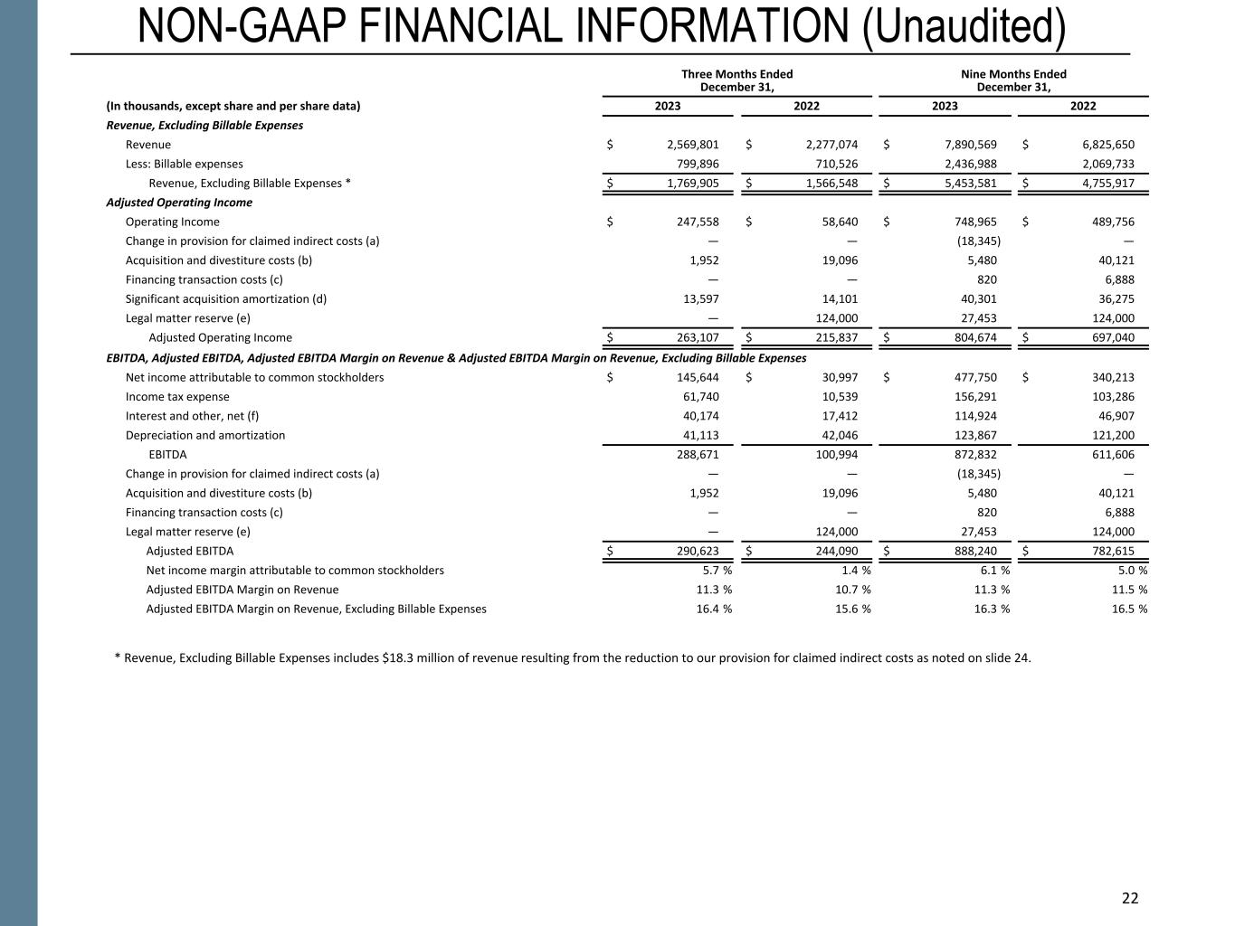 22 NON-GAAP FINANCIAL INFORMATION (Unaudited) Three Months Ended December 31, Nine Months Ended December 31, (In thousands, except share and per share data) 2023 2022 2023 2022 Revenue, Excluding Billable Expenses Revenue $ 2,569,801 $ 2,277,074 $ 7,890,569 $ 6,825,650 Less: Billable expenses 799,896 710,526 2,436,988 2,069,733 Revenue, Excluding Billable Expenses * $ 1,769,905 $ 1,566,548 $ 5,453,581 $ 4,755,917 Adjusted Operating Income Operating Income $ 247,558 $ 58,640 $ 748,965 $ 489,756 Change in provision for claimed indirect costs (a) — — (18,345) — Acquisition and divestiture costs (b) 1,952 19,096 5,480 40,121 Financing transaction costs (c) — — 820 6,888 Significant acquisition amortization (d) 13,597 14,101 40,301 36,275 Legal matter reserve (e) — 124,000 27,453 124,000 Adjusted Operating Income $ 263,107 $ 215,837 $ 804,674 $ 697,040 EBITDA, Adjusted EBITDA, Adjusted EBITDA Margin on Revenue & Adjusted EBITDA Margin on Revenue, Excluding Billable Expenses Net income attributable to common stockholders $ 145,644 $ 30,997 $ 477,750 $ 340,213 Income tax expense 61,740 10,539 156,291 103,286 Interest and other, net (f) 40,174 17,412 114,924 46,907 Depreciation and amortization 41,113 42,046 123,867 121,200 EBITDA 288,671 100,994 872,832 611,606 Change in provision for claimed indirect costs (a) — — (18,345) — Acquisition and divestiture costs (b) 1,952 19,096 5,480 40,121 Financing transaction costs (c) — — 820 6,888 Legal matter reserve (e) — 124,000 27,453 124,000 Adjusted EBITDA $ 290,623 $ 244,090 $ 888,240 $ 782,615 Net income margin attributable to common stockholders 5.7 % 1.4 % 6.1 % 5.0 % Adjusted EBITDA Margin on Revenue 11.3 % 10.7 % 11.3 % 11.5 % Adjusted EBITDA Margin on Revenue, Excluding Billable Expenses 16.4 % 15.6 % 16.3 % 16.5 % 22 * Revenue, Excluding Billable Expenses includes $18.3 million of revenue resulting from the reduction to our provision for claimed indirect costs as noted on slide 24.