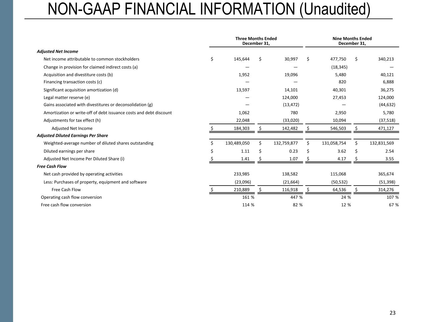 23 NON-GAAP FINANCIAL INFORMATION (Unaudited) Three Months Ended December 31, Nine Months Ended December 31, Adjusted Net Income Net income attributable to common stockholders $ 145,644 $ 30,997 $ 477,750 $ 340,213 Change in provision for claimed indirect costs (a) — — (18,345) — Acquisition and divestiture costs (b) 1,952 19,096 5,480 40,121 Financing transaction costs (c) — — 820 6,888 Significant acquisition amortization (d) 13,597 14,101 40,301 36,275 Legal matter reserve (e) — 124,000 27,453 124,000 Gains associated with divestitures or deconsolidation (g) — (13,472) — (44,632) Amortization or write-off of debt issuance costs and debt discount 1,062 780 2,950 5,780 Adjustments for tax effect (h) 22,048 (33,020) 10,094 (37,518) Adjusted Net Income $ 184,303 $ 142,482 $ 546,503 $ 471,127 Adjusted Diluted Earnings Per Share Weighted-average number of diluted shares outstanding $ 130,489,050 $ 132,759,877 $ 131,058,754 $ 132,831,569 Diluted earnings per share $ 1.11 $ 0.23 $ 3.62 $ 2.54 Adjusted Net Income Per Diluted Share (i) $ 1.41 $ 1.07 $ 4.17 $ 3.55 Free Cash Flow Net cash provided by operating activities 233,985 138,582 115,068 365,674 Less: Purchases of property, equipment and software (23,096) (21,664) (50,532) (51,398) Free Cash Flow $ 210,889 $ 116,918 $ 64,536 $ 314,276 Operating cash flow conversion 161 % 447 % 24 % 107 % Free cash flow conversion 114 % 82 % 12 % 67 % 23