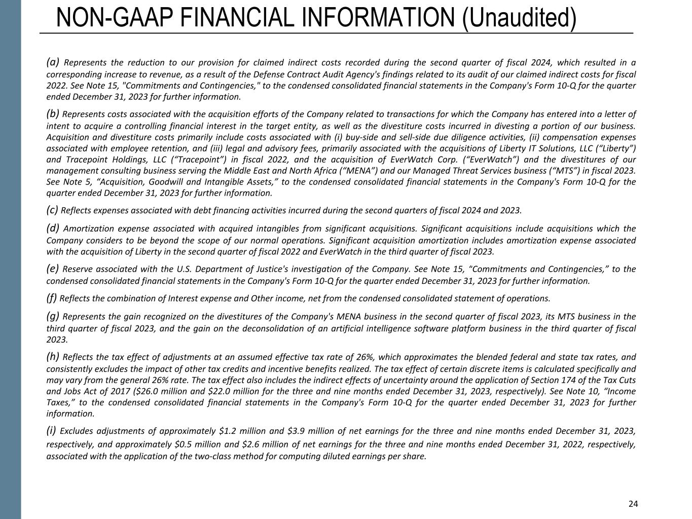 24 NON-GAAP FINANCIAL INFORMATION (Unaudited) (a) Represents the reduction to our provision for claimed indirect costs recorded during the second quarter of fiscal 2024, which resulted in a corresponding increase to revenue, as a result of the Defense Contract Audit Agency's findings related to its audit of our claimed indirect costs for fiscal 2022. See Note 15, "Commitments and Contingencies," to the condensed consolidated financial statements in the Company's Form 10-Q for the quarter ended December 31, 2023 for further information. (b) Represents costs associated with the acquisition efforts of the Company related to transactions for which the Company has entered into a letter of intent to acquire a controlling financial interest in the target entity, as well as the divestiture costs incurred in divesting a portion of our business. Acquisition and divestiture costs primarily include costs associated with (i) buy-side and sell-side due diligence activities, (ii) compensation expenses associated with employee retention, and (iii) legal and advisory fees, primarily associated with the acquisitions of Liberty IT Solutions, LLC (“Liberty”) and Tracepoint Holdings, LLC (“Tracepoint”) in fiscal 2022, and the acquisition of EverWatch Corp. (“EverWatch”) and the divestitures of our management consulting business serving the Middle East and North Africa (“MENA”) and our Managed Threat Services business (“MTS”) in fiscal 2023. See Note 5, “Acquisition, Goodwill and Intangible Assets,” to the condensed consolidated financial statements in the Company's Form 10-Q for the quarter ended December 31, 2023 for further information. (c) Reflects expenses associated with debt financing activities incurred during the second quarters of fiscal 2024 and 2023. (d) Amortization expense associated with acquired intangibles from significant acquisitions. Significant acquisitions include acquisitions which the Company considers to be beyond the scope of our normal operations. Significant acquisition amortization includes amortization expense associated with the acquisition of Liberty in the second quarter of fiscal 2022 and EverWatch in the third quarter of fiscal 2023. (e) Reserve associated with the U.S. Department of Justice's investigation of the Company. See Note 15, “Commitments and Contingencies,” to the condensed consolidated financial statements in the Company's Form 10-Q for the quarter ended December 31, 2023 for further information. (f) Reflects the combination of Interest expense and Other income, net from the condensed consolidated statement of operations. (g) Represents the gain recognized on the divestitures of the Company's MENA business in the second quarter of fiscal 2023, its MTS business in the third quarter of fiscal 2023, and the gain on the deconsolidation of an artificial intelligence software platform business in the third quarter of fiscal 2023. (h) Reflects the tax effect of adjustments at an assumed effective tax rate of 26%, which approximates the blended federal and state tax rates, and consistently excludes the impact of other tax credits and incentive benefits realized. The tax effect of certain discrete items is calculated specifically and may vary from the general 26% rate. The tax effect also includes the indirect effects of uncertainty around the application of Section 174 of the Tax Cuts and Jobs Act of 2017 ($26.0 million and $22.0 million for the three and nine months ended December 31, 2023, respectively). See Note 10, “Income Taxes,” to the condensed consolidated financial statements in the Company's Form 10-Q for the quarter ended December 31, 2023 for further information. (i) Excludes adjustments of approximately $1.2 million and $3.9 million of net earnings for the three and nine months ended December 31, 2023, respectively, and approximately $0.5 million and $2.6 million of net earnings for the three and nine months ended December 31, 2022, respectively, associated with the application of the two-class method for computing diluted earnings per share. 24