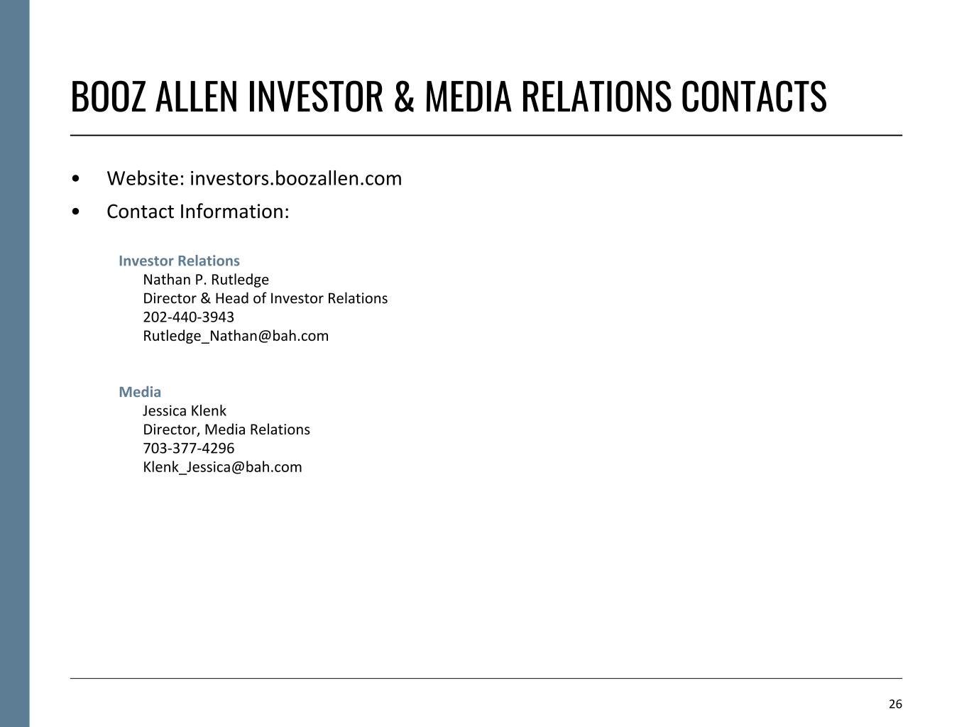 BOOZ ALLEN INVESTOR & MEDIA RELATIONS CONTACTS 26 • Website: investors.boozallen.com • Contact Information: Investor Relations Nathan P. Rutledge Director & Head of Investor Relations 202-440-3943 Rutledge_Nathan@bah.com Media Jessica Klenk Director, Media Relations 703-377-4296 Klenk_Jessica@bah.com