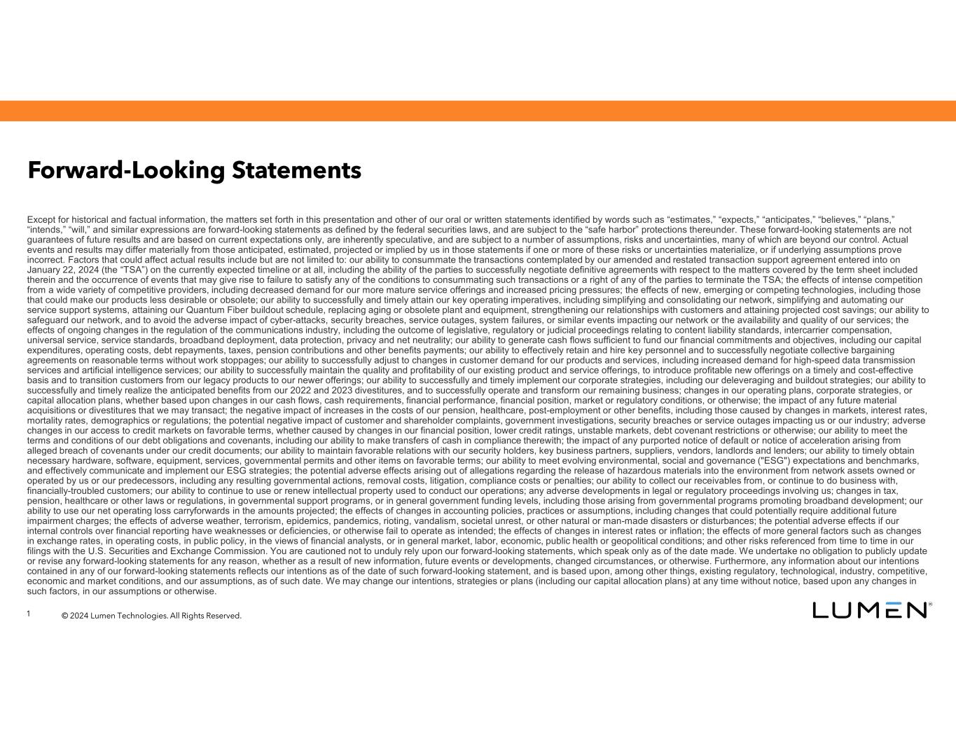 © 2024 Lumen Technologies. All Rights Reserved. 1 Forward-Looking Statements Except for historical and factual information, the matters set forth in this presentation and other of our oral or written statements identified by words such as “estimates,” “expects,” “anticipates,” “believes,” “plans,” “intends,” “will,” and similar expressions are forward-looking statements as defined by the federal securities laws, and are subject to the “safe harbor” protections thereunder. These forward-looking statements are not guarantees of future results and are based on current expectations only, are inherently speculative, and are subject to a number of assumptions, risks and uncertainties, many of which are beyond our control. Actual events and results may differ materially from those anticipated, estimated, projected or implied by us in those statements if one or more of these risks or uncertainties materialize, or if underlying assumptions prove incorrect. Factors that could affect actual results include but are not limited to: our ability to consummate the transactions contemplated by our amended and restated transaction support agreement entered into on January 22, 2024 (the “TSA”) on the currently expected timeline or at all, including the ability of the parties to successfully negotiate definitive agreements with respect to the matters covered by the term sheet included therein and the occurrence of events that may give rise to failure to satisfy any of the conditions to consummating such transactions or a right of any of the parties to terminate the TSA; the effects of intense competition from a wide variety of competitive providers, including decreased demand for our more mature service offerings and increased pricing pressures; the effects of new, emerging or competing technologies, including those that could make our products less desirable or obsolete; our ability to successfully and timely attain our key operating imperatives, including simplifying and consolidating our network, simplifying and automating our service support systems, attaining our Quantum Fiber buildout schedule, replacing aging or obsolete plant and equipment, strengthening our relationships with customers and attaining projected cost savings; our ability to safeguard our network, and to avoid the adverse impact of cyber-attacks, security breaches, service outages, system failures, or similar events impacting our network or the availability and quality of our services; the effects of ongoing changes in the regulation of the communications industry, including the outcome of legislative, regulatory or judicial proceedings relating to content liability standards, intercarrier compensation, universal service, service standards, broadband deployment, data protection, privacy and net neutrality; our ability to generate cash flows sufficient to fund our financial commitments and objectives, including our capital expenditures, operating costs, debt repayments, taxes, pension contributions and other benefits payments; our ability to effectively retain and hire key personnel and to successfully negotiate collective bargaining agreements on reasonable terms without work stoppages; our ability to successfully adjust to changes in customer demand for our products and services, including increased demand for high-speed data transmission services and artificial intelligence services; our ability to successfully maintain the quality and profitability of our existing product and service offerings, to introduce profitable new offerings on a timely and cost-effective basis and to transition customers from our legacy products to our newer offerings; our ability to successfully and timely implement our corporate strategies, including our deleveraging and buildout strategies; our ability to successfully and timely realize the anticipated benefits from our 2022 and 2023 divestitures, and to successfully operate and transform our remaining business; changes in our operating plans, corporate strategies, or capital allocation plans, whether based upon changes in our cash flows, cash requirements, financial performance, financial position, market or regulatory conditions, or otherwise; the impact of any future material acquisitions or divestitures that we may transact; the negative impact of increases in the costs of our pension, healthcare, post-employment or other benefits, including those caused by changes in markets, interest rates, mortality rates, demographics or regulations; the potential negative impact of customer and shareholder complaints, government investigations, security breaches or service outages impacting us or our industry; adverse changes in our access to credit markets on favorable terms, whether caused by changes in our financial position, lower credit ratings, unstable markets, debt covenant restrictions or otherwise; our ability to meet the terms and conditions of our debt obligations and covenants, including our ability to make transfers of cash in compliance therewith; the impact of any purported notice of default or notice of acceleration arising from alleged breach of covenants under our credit documents; our ability to maintain favorable relations with our security holders, key business partners, suppliers, vendors, landlords and lenders; our ability to timely obtain necessary hardware, software, equipment, services, governmental permits and other items on favorable terms; our ability to meet evolving environmental, social and governance ("ESG") expectations and benchmarks, and effectively communicate and implement our ESG strategies; the potential adverse effects arising out of allegations regarding the release of hazardous materials into the environment from network assets owned or operated by us or our predecessors, including any resulting governmental actions, removal costs, litigation, compliance costs or penalties; our ability to collect our receivables from, or continue to 