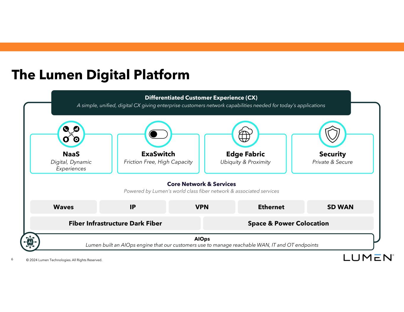 © 2024 Lumen Technologies. All Rights Reserved. 5 The Path of Disruption Legacy Business Wireline CommunicationInternet Access Voice Simple, point-to-point connectivity, transaction based Data Transfer E-Commerce Digital Economy Landscape Complex, multi-layered, outcome based AI/ML AR/VR SaaS Big Data Apps & Services Hybrid Cloud Edge Security Connected cities Streaming Data migration Digital self-service Dynamic Scaling Networks Need to Support the Digital Economy 5