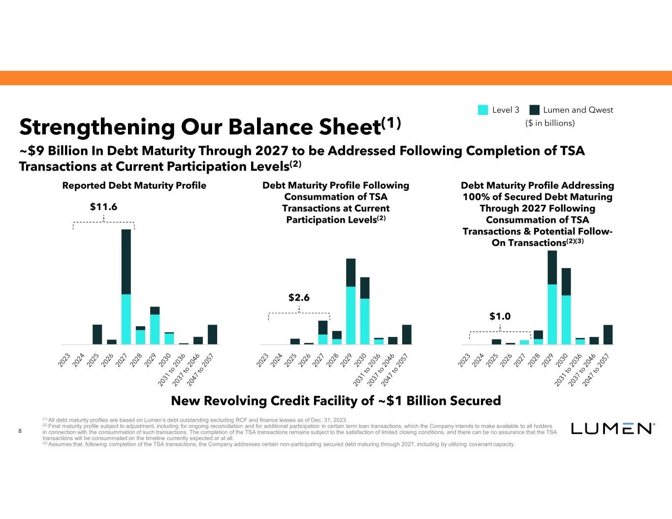 © 2024 Lumen Technologies. All Rights Reserved. 8 ~$9 Billion In Debt Maturity Through 2027 to be Addressed Following Completion of TSA Transactions at Current Participation Levels(2) Strengthening Our Balance Sheet(1) Reported Debt Maturity Profile $11.6 $2.6 $1.0 ($ in billions) Lumen and QwestLevel 3 Debt Maturity Profile Following Consummation of TSA Transactions at Current Participation Levels(2) (1) All debt maturity profiles are based on Lumen’s debt outstanding excluding RCF and finance leases as of Dec. 31, 2023. (2) Final maturity profile subject to adjustment, including for ongoing reconciliation and for additional participation in certain term loan transactions, which the Company intends to make available to all holders in connection with the consummation of such transactions. The completion of the TSA transactions remains subject to the satisfaction of limited closing conditions, and there can be no assurance that the TSA transactions will be consummated on the timeline currently expected or at all. (3) Assumes that, following completion of the TSA transactions, the Company addresses certain non-participating secured debt maturing through 2027, including by utilizing covenant capacity. Debt Maturity Profile Addressing 100% of Secured Debt Maturing Through 2027 Following Consummation of TSA Transactions & Potential Follow- On Transactions(2)(3) New Revolving Credit Facility of ~$1 Billion Secured