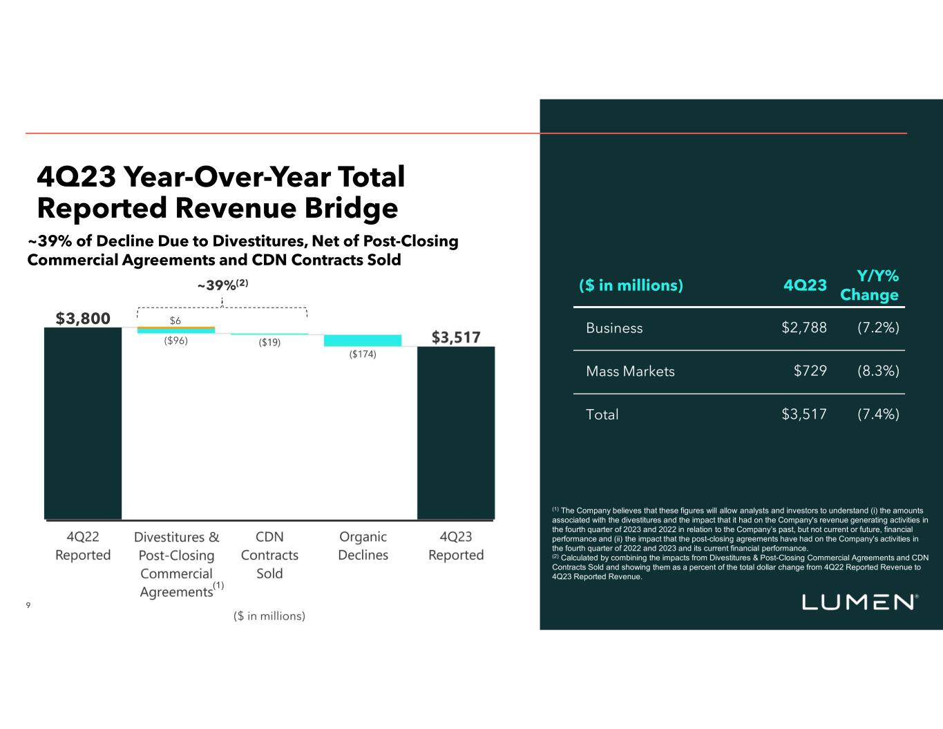 4Q23 Year-Over-Year Total Reported Revenue Bridge ~39% of Decline Due to Divestitures, Net of Post-Closing Commercial Agreements and CDN Contracts Sold (1) The Company believes that these figures will allow analysts and investors to understand (i) the amounts associated with the divestitures and the impact that it had on the Company's revenue generating activities in the fourth quarter of 2023 and 2022 in relation to the Company’s past, but not current or future, financial performance and (ii) the impact that the post-closing agreements have had on the Company's activities in the fourth quarter of 2022 and 2023 and its current financial performance. (2) Calculated by combining the impacts from Divestitures & Post-Closing Commercial Agreements and CDN Contracts Sold and showing them as a percent of the total dollar change from 4Q22 Reported Revenue to 4Q23 Reported Revenue. Y/Y% Change4Q23($ in millions) (7.2%)$2,788Business (8.3%)$729Mass Markets (7.4%)$3,517Total $6 (1) ($96) ~39%(2) $3,800 9