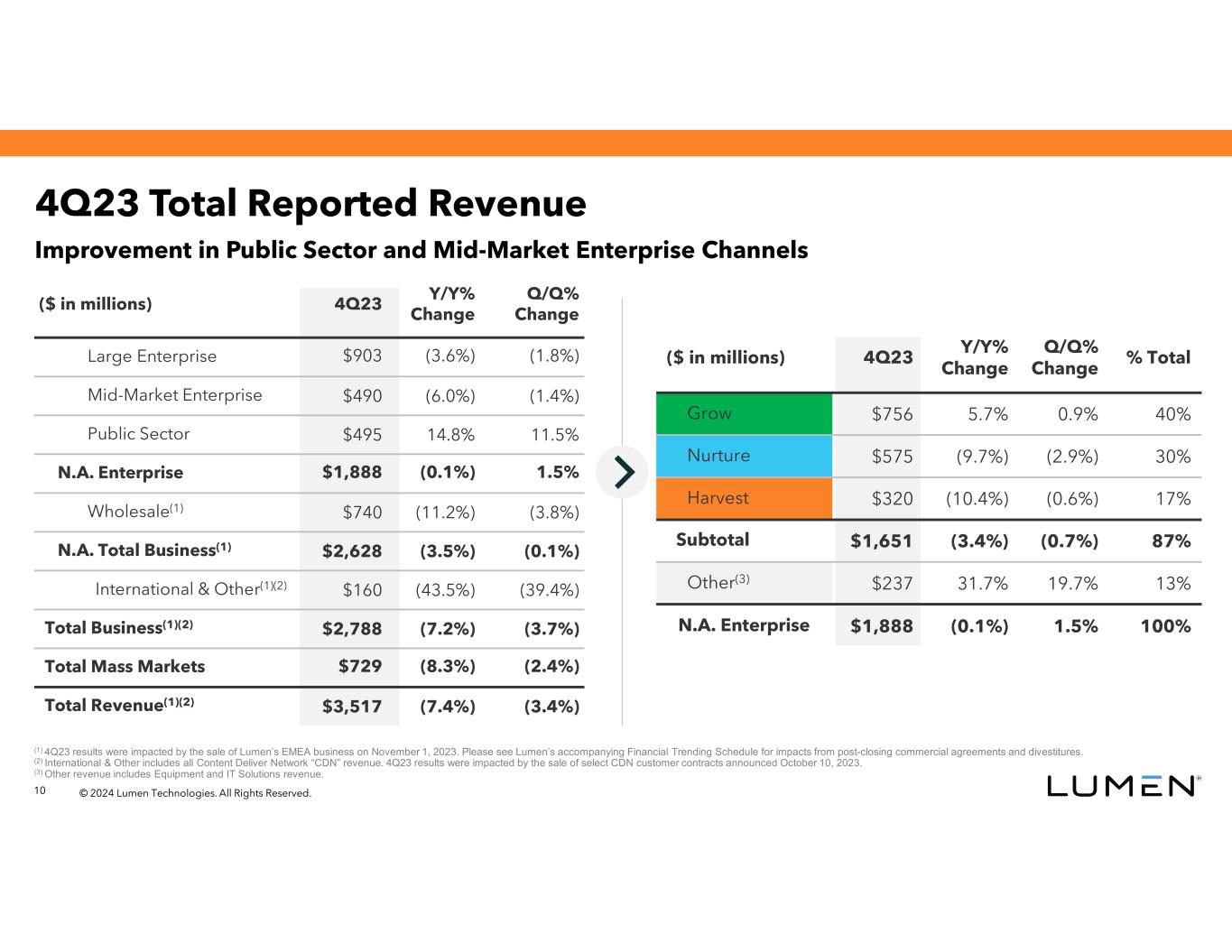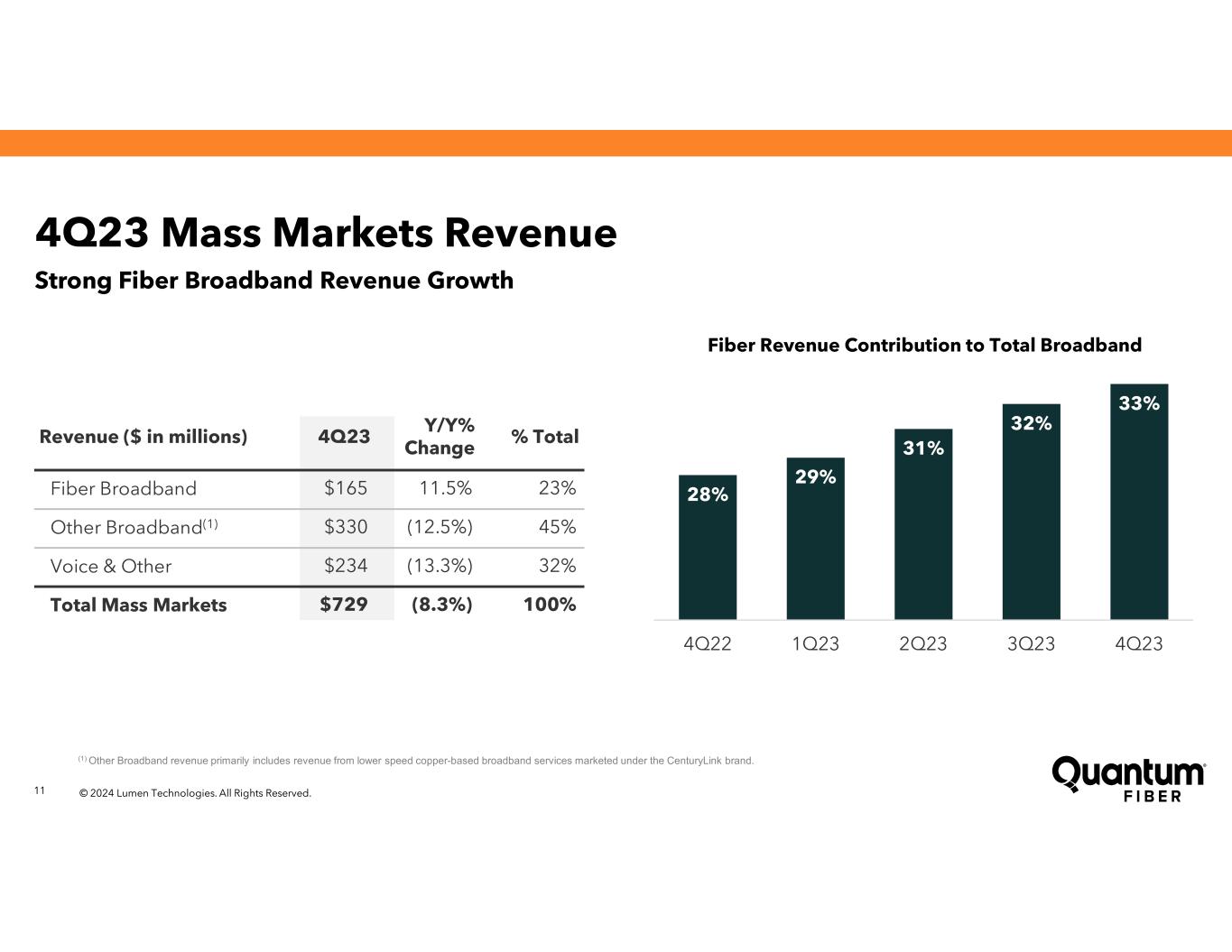 © 2024 Lumen Technologies. All Rights Reserved. 10 % TotalQ/Q% Change Y/Y% Change4Q23($ in millions) 40%0.9%5.7%$756Grow 30%(2.9%)(9.7%)$575Nurture 17%(0.6%)(10.4%)$320Harvest 87%(0.7%)(3.4%)$1,651Subtotal 13%19.7%31.7%$237Other(3) 100%1.5%(0.1%)$1,888N.A. Enterprise Q/Q% Change Y/Y% Change4Q23($ in millions) (1.8%)(3.6%)$903Large Enterprise (1.4%)(6.0%)$490Mid-Market Enterprise 11.5%14.8%$495Public Sector 1.5%(0.1%)$1,888N.A. Enterprise (3.8%)(11.2%)$740Wholesale(1) (0.1%)(3.5%)$2,628N.A. Total Business(1) (39.4%)(43.5%)$160International & Other(1)(2) (3.7%)(7.2%)$2,788Total Business(1)(2) (2.4%)(8.3%)$729Total Mass Markets (3.4%)(7.4%)$3,517Total Revenue(1)(2) 4Q23 Total Reported Revenue (1) 4Q23 results were impacted by the sale of Lumen’s EMEA business on November 1, 2023. Please see Lumen’s accompanying Financial Trending Schedule for impacts from post-closing commercial agreements and divestitures. (2) International & Other includes all Content Deliver Network “CDN” revenue. 4Q23 results were impacted by the sale of select CDN customer contracts announced October 10, 2023. (3) Other revenue includes Equipment and IT Solutions revenue. Improvement in Public Sector and Mid-Market Enterprise Channels