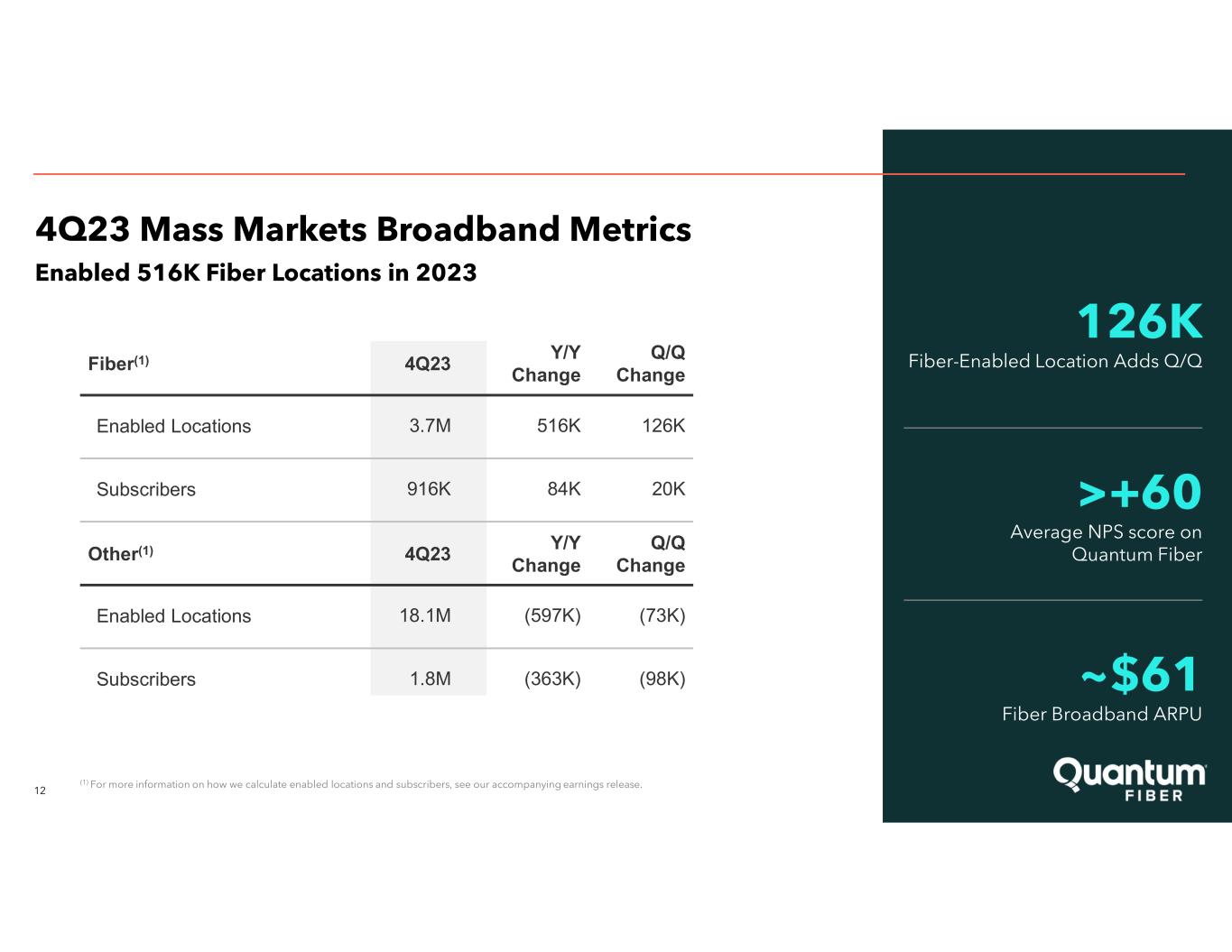 4Q23 Mass Markets Broadband Metrics 126K Fiber-Enabled Location Adds Q/Q >+60 Average NPS score on Quantum Fiber ~$61 Fiber Broadband ARPU (1) For more information on how we calculate enabled locations and subscribers, see our accompanying earnings release. Enabled 516K Fiber Locations in 2023 Q/Q Change Y/Y Change 4Q23Fiber(1) 126K516K3.7MEnabled Locations 20K84K916KSubscribers Q/Q Change Y/Y Change 4Q23Other(1) (73K)(597K)18.1MEnabled Locations (98K)(363K)1.8MSubscribers 12