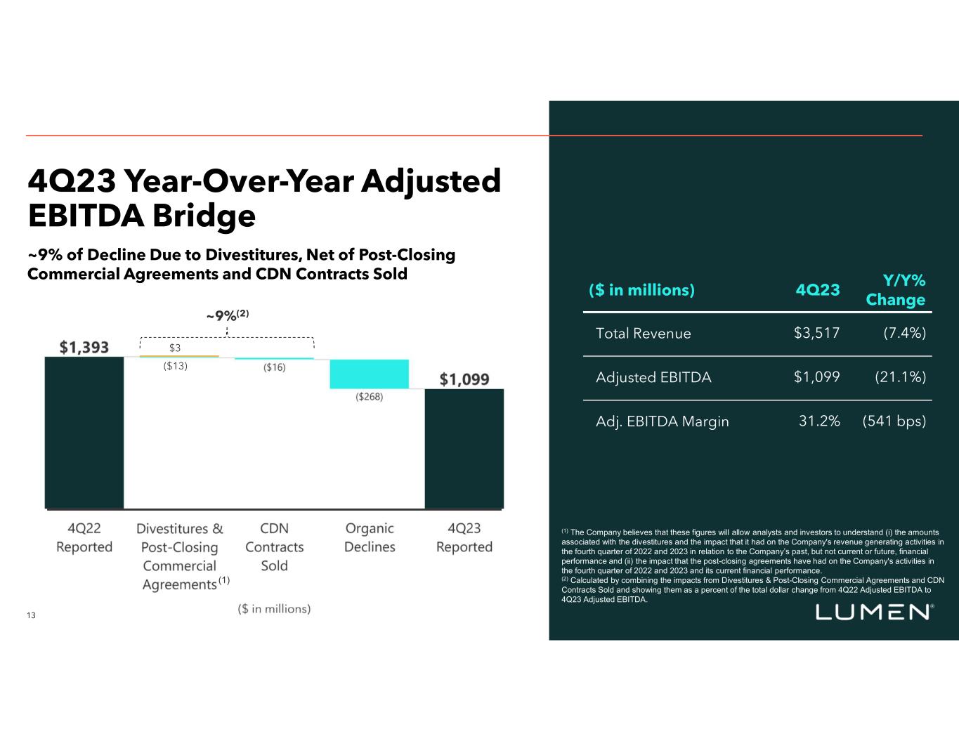 ~9%(2) 4Q23 Year-Over-Year Adjusted EBITDA Bridge ~9% of Decline Due to Divestitures, Net of Post-Closing Commercial Agreements and CDN Contracts Sold $3 (1) ($13) (1) The Company believes that these figures will allow analysts and investors to understand (i) the amounts associated with the divestitures and the impact that it had on the Company's revenue generating activities in the fourth quarter of 2022 and 2023 in relation to the Company’s past, but not current or future, financial performance and (ii) the impact that the post-closing agreements have had on the Company's activities in the fourth quarter of 2022 and 2023 and its current financial performance. (2) Calculated by combining the impacts from Divestitures & Post-Closing Commercial Agreements and CDN Contracts Sold and showing them as a percent of the total dollar change from 4Q22 Adjusted EBITDA to 4Q23 Adjusted EBITDA. Y/Y% Change4Q23($ in millions) (7.4%)$3,517Total Revenue (21.1%)$1,099Adjusted EBITDA (541 bps)31.2%Adj. EBITDA Margin 13