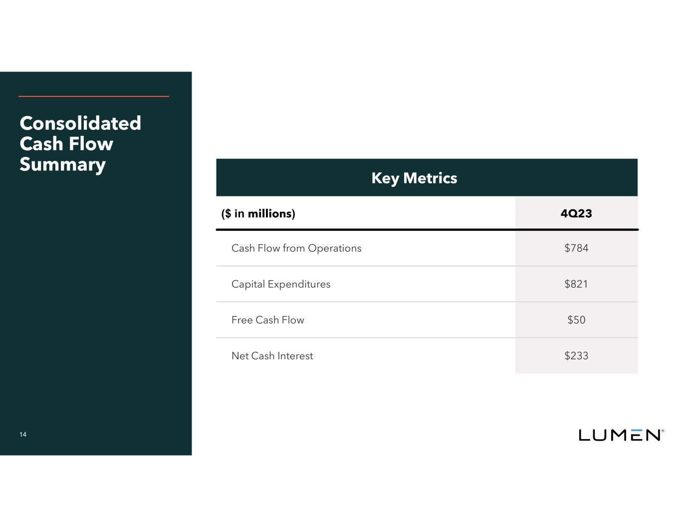 "In 2023, we outlined big, multi-year, strategic priorities including strengthening our balance sheet, executing on key programs to turn the core business around by 2025, and igniting new growth by delivering disruptive innovations that help our customers solve their next-gen networking needs,” said Kate Johnson, president and CEO of Lumen. “I am pleased to report that we delivered our 2023 EBITDA and free cash flow guidance, and we made material progress on our strategic priorities."