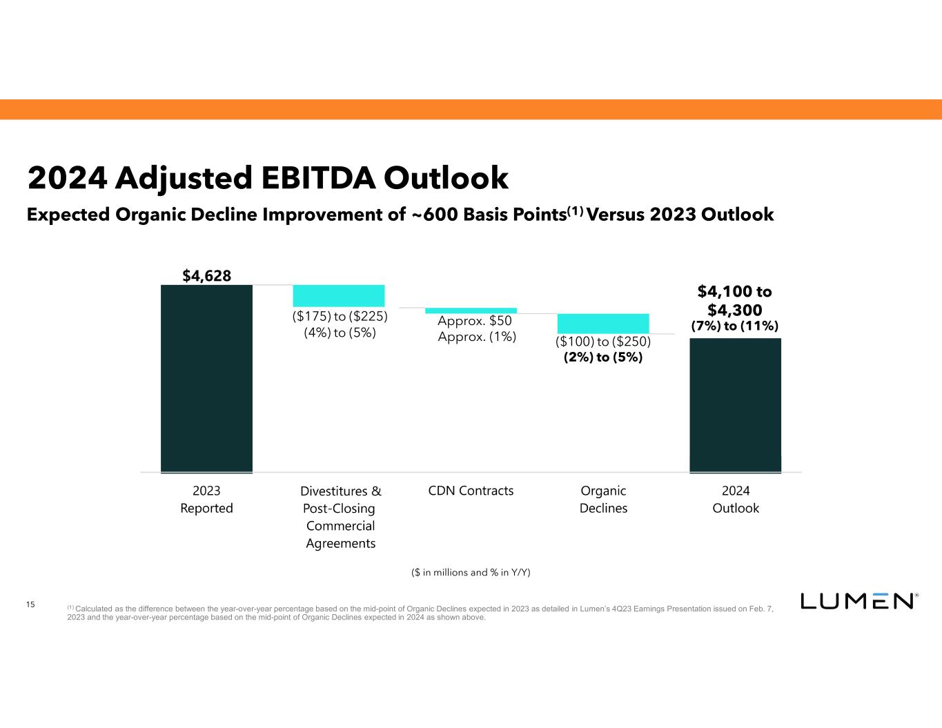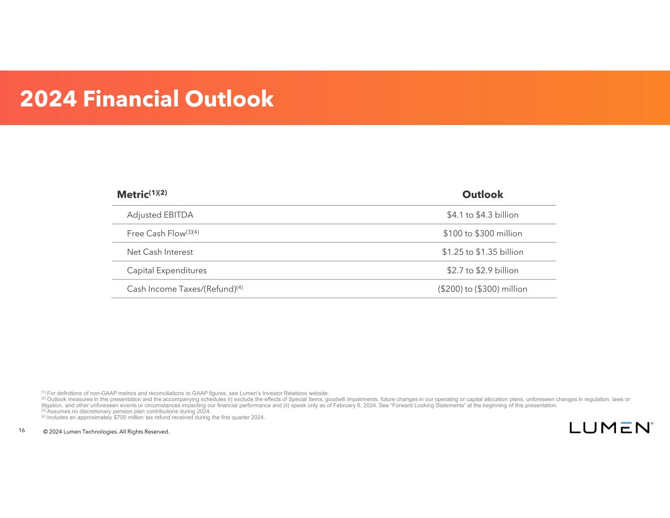 © 2024 Lumen Technologies. All Rights Reserved. 15 2024 Adjusted EBITDA Outlook (7%) to (11%) $4,100 to $4,300 ($100) to ($250) ($ in millions and % in Y/Y) ($175) to ($225) Approx. $50 (2%) to (5%) (4%) to (5%) Approx. (1%) Expected Organic Decline Improvement of ~600 Basis Points(1) Versus 2023 Outlook (1) Calculated as the difference between the year-over-year percentage based on the mid-point of Organic Declines expected in 2023 as detailed in Lumen’s 4Q23 Earnings Presentation issued on Feb. 7, 2023 and the year-over-year percentage based on the mid-point of Organic Declines expected in 2024 as shown above.