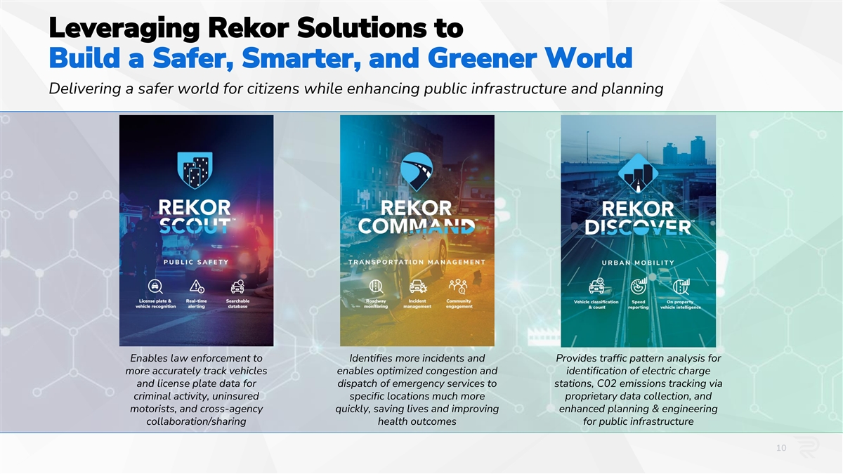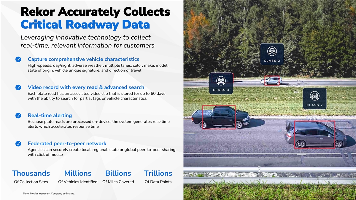 Rekor Accurately Collects Critical Roadway Data Leveraging innovative technology to collect real-time, relevant information for customers Capture comprehensive vehicle characteristics High-speeds, day/night, adverse weather, multiple lanes, color, make, model, state of origin, vehicle unique signature, and direction of travel Video record with every read & advanced search Each plate read has an associated video clip that is stored for up to 60 days with the ability to search for partial tags or vehicle characteristics Real-time alerting Because plate reads are processed on-device, the system generates real-time alerts which accelerates response time Federated peer-to-peer network Agencies can securely create local, regional, state or global peer-to-peer sharing with click of mouse Thousands Millions Billions Trillions Of Collection Sites Of Vehicles Identified Of Miles Covered Of Data Points Note: Metrics represent Company estimates.