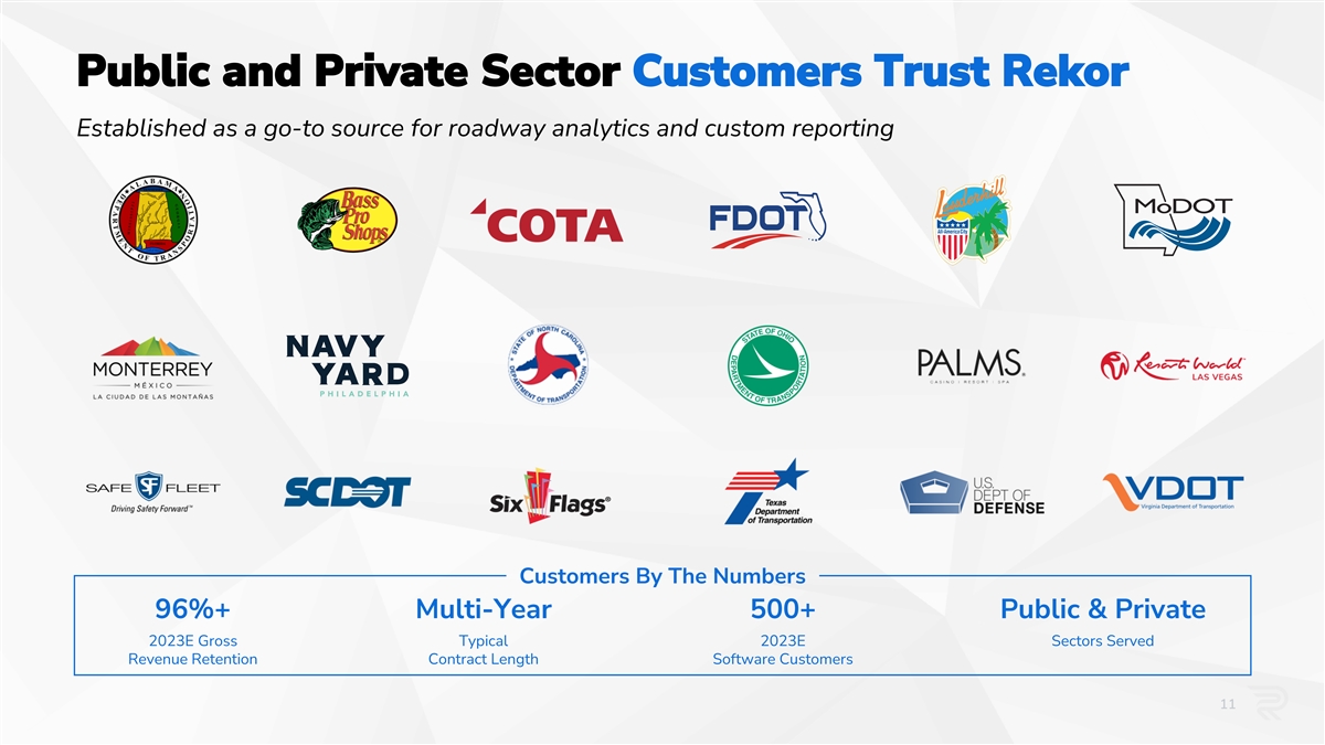 Public and Private Sector Customers Trust Rekor Established as a go-to source for roadway analytics and custom reporting Customers By The Numbers 96%+ Multi-Year 500+ Public & Private 2023E Gross Typical 2023E Sectors Served Revenue Retention Contract Length Software Customers