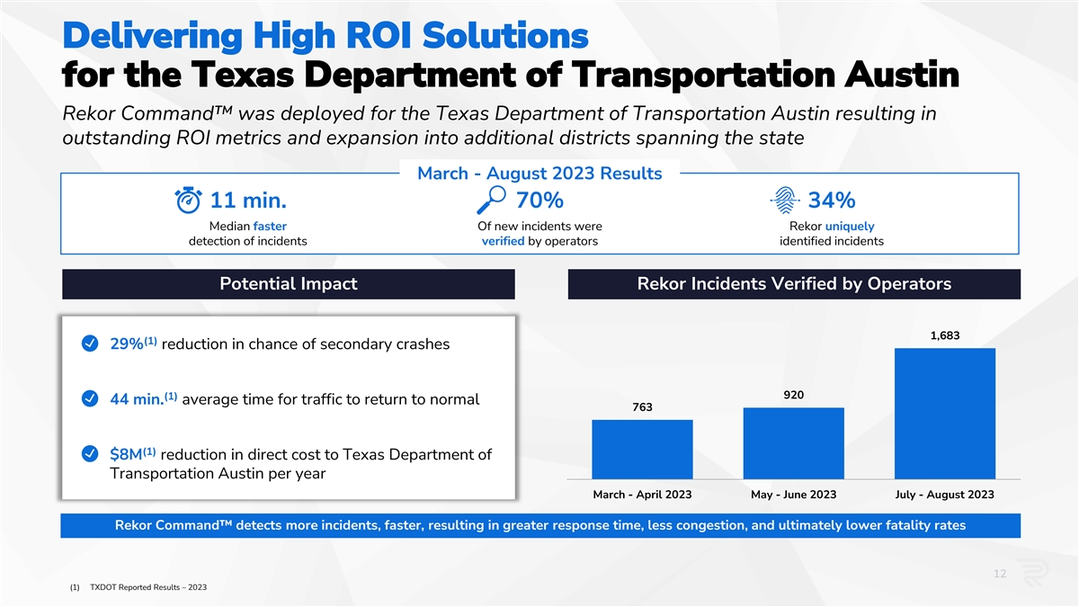 Delivering High ROI Solutions for the Texas Department of Transportation Austin Rekor Command™ was deployed for the Texas Department of Transportation Austin resulting in outstanding ROI metrics and expansion into additional districts spanning the state March - August 2023 Results 11 min. 70% 34% Median faster Of new incidents were Rekor uniquely detection of incidents verified by operators identified incidents Potential Impact Rekor Incidents Verified by Operators 1,683 (1) 29% reduction in chance of secondary crashes 920 (1) 44 min. average time for traffic to return to normal 763 (1) $8M reduction in direct cost to Texas Department of Transportation Austin per year March - April 2023 May - June 2023 July - August 2023 Rekor Command™ detects more incidents, faster, resulting in greater response time, less congestion, and ultimately lower fatality rates (1) TXDOT Reported Results – 2023