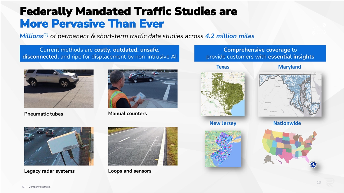 Federally Mandated Traffic Studies are More Pervasive Than Ever (1) Millions of permanent & short-term traffic data studies across 4.2 million miles Current methods are costly, outdated, unsafe, Comprehensive coverage to disconnected, and ripe for displacement by non-intrusive AI provide customers with essential insights Texas Maryland Manual counters Pneumatic tubes New Jersey Nationwide Legacy radar systems Loops and sensors (1) Company estimate.