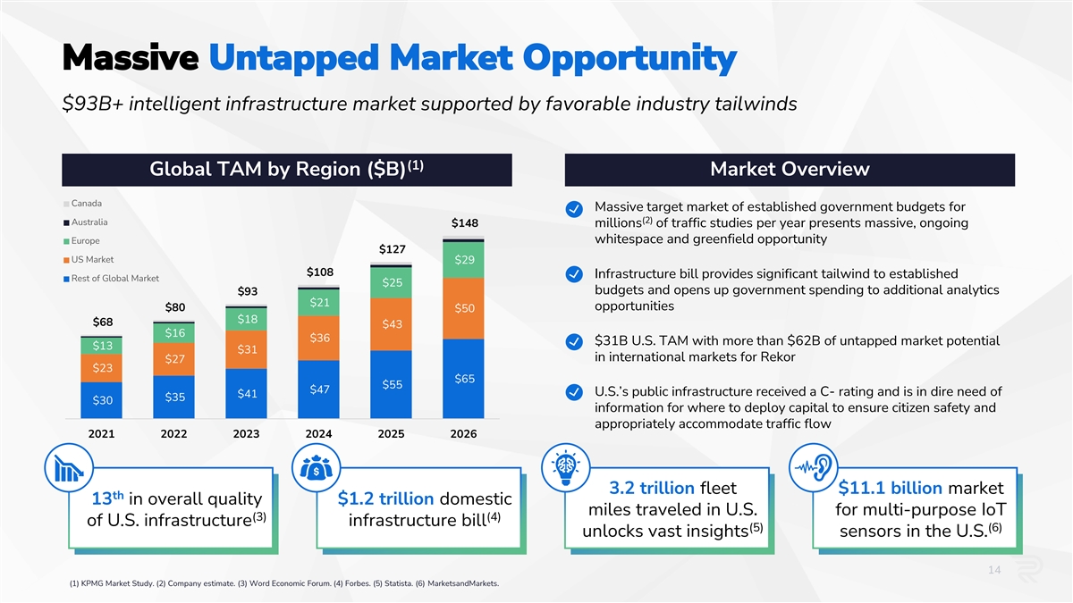 Massive Untapped Market Opportunity $93B+ intelligent infrastructure market supported by favorable industry tailwinds (1) Global TAM by Region ($B) Market Overview Canada Massive target market of established government budgets for (2) Australia $148 millions of traffic studies per year presents massive, ongoing Europe whitespace and greenfield opportunity $127 US Market $29 $108 Infrastructure bill provides significant tailwind to established Rest of Global Market $25 budgets and opens up government spending to additional analytics $93 $21 opportunities $80 $50 $18 $68 $43 $16 $36 $31B U.S. TAM with more than $62B of untapped market potential $13 $31 in international markets for Rekor $27 $23 $65 $55 $47 U.S.’s public infrastructure received a C- rating and is in dire need of $41 $35 $30 information for where to deploy capital to ensure citizen safety and appropriately accommodate traffic flow 2021 2022 2023 2024 2025 2026 3.2 trillion fleet $11.1 billion market th 13 in overall quality $1.2 trillion domestic miles traveled in U.S. for multi-purpose IoT (3) (4) of U.S. infrastructure infrastructure bill (5) (6) unlocks vast insights sensors in the U.S. (1) KPMG Market Study. (2) Company estimate. (3) Word Economic Forum. (4) Forbes. (5) Statista. (6) MarketsandMarkets.