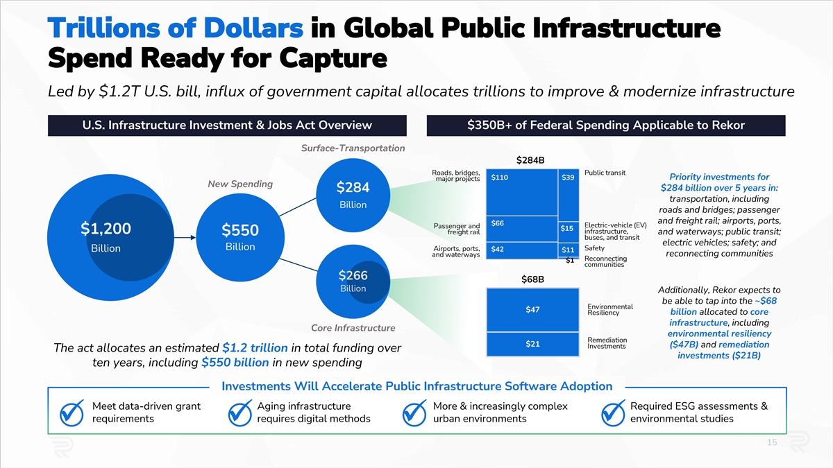 Trillions of Dollars in Global Public Infrastructure Spend Ready for Capture Led by $1.2T U.S. bill, influx of government capital allocates trillions to improve & modernize infrastructure U.S. Infrastructure Investment & Jobs Act Overview $350B+ of Federal Spending Applicable to Rekor Surface-Transportation $284B Roads, bridges, Public transit $110 $39 Priority investments for major projects New Spending $284 billion over 5 years in: $284 transportation, including Billion roads and bridges; passenger and freight rail; airports, ports, $66 Electric-vehicle (EV) Passenger and $15 $1,200 freight rail infrastructure, and waterways; public transit; $550 buses, and transit electric vehicles; safety; and Billion Safety Airports, ports, $42 Billion $11 reconnecting communities and waterways Reconnecting $1 communities $266 $68B Billion Additionally, Rekor expects to be able to tap into the ~$68 Environmental $47 billion allocated to core Resiliency infrastructure, including Core Infrastructure environmental resiliency Remediation $21 ($47B) and remediation Investments The act allocates an estimated $1.2 trillion in total funding over investments ($21B) ten years, including $550 billion in new spending Investments Will Accelerate Public Infrastructure Software Adoption Meet data-driven grant Aging infrastructure More & increasingly complex Required ESG assessments & requirements requires digital methods urban environments environmental studies ✓✓✓✓