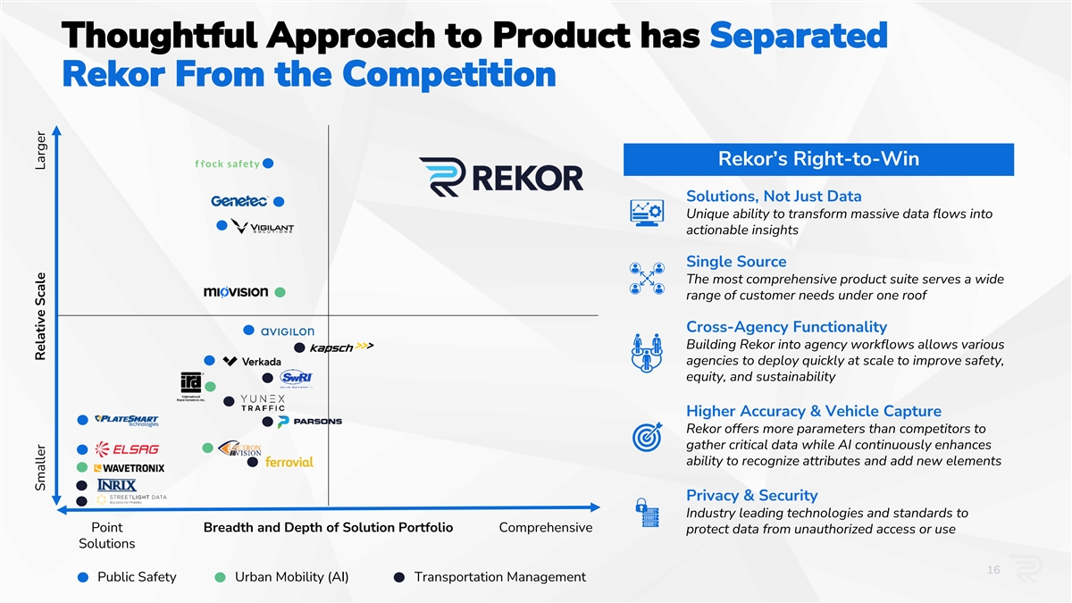 Thoughtful Approach to Product has Separated Rekor From the Competition Rekor’s Right-to-Win Solutions, Not Just Data Unique ability to transform massive data flows into actionable insights Single Source The most comprehensive product suite serves a wide range of customer needs under one roof Cross-Agency Functionality Building Rekor into agency workflows allows various agencies to deploy quickly at scale to improve safety, equity, and sustainability Higher Accuracy & Vehicle Capture Rekor offers more parameters than competitors to gather critical data while AI continuously enhances ability to recognize attributes and add new elements Privacy & Security Industry leading technologies and standards to Point Breadth and Depth of Solution Portfolio Comprehensive protect data from unauthorized access or use Solutions Public Safety Urban Mobility (AI) Transportation Management Smaller Relative Scale Larger