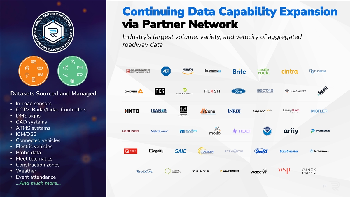 Continuing Data Capability Expansion via Partner Network Industry’s largest volume, variety, and velocity of aggregated roadway data Datasets Sourced and Managed: • In-road sensors • CCTV, Radar/Lidar, Controllers • DMS signs • CAD systems • ATMS systems • ICM/DSS • Connected vehicles • Electric vehicles • Probe data • Fleet telematics • Construction zones • Weather • Event attendance …And much more…