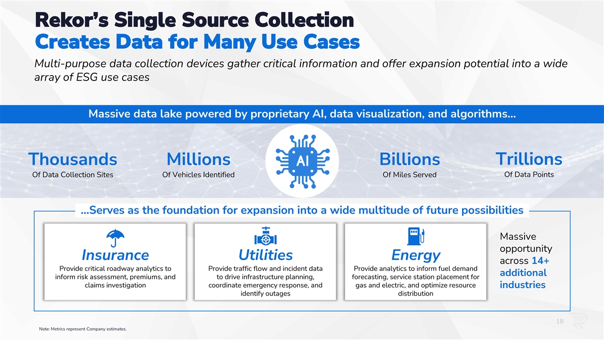 Rekor’s Single Source Collection Creates Data for Many Use Cases Multi-purpose data collection devices gather critical information and offer expansion potential into a wide array of ESG use cases Massive data lake powered by proprietary AI, data visualization, and algorithms… Thousands Millions Billions Trillions Of Data Points Of Data Collection Sites Of Vehicles Identified Of Miles Served …Serves as the foundation for expansion into a wide multitude of future possibilities Massive opportunity Insurance Utilities Energy across 14+ Provide critical roadway analytics to Provide traffic flow and incident data Provide analytics to inform fuel demand additional inform risk assessment, premiums, and to drive infrastructure planning, forecasting, service station placement for claims investigation coordinate emergency response, and gas and electric, and optimize resource industries identify outages distribution Note: Metrics represent Company estimates.