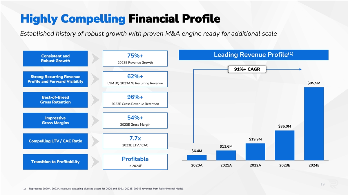 Highly Compelling Financial Profile Established history of robust growth with proven M&A engine ready for additional scale (1) Leading Revenue Profile Consistent and 75%+ Robust Growth 2023E Revenue Growth 91%+ CAGR Strong Recurring Revenue 62%+ Profile and Forward Visibility L9M 3Q 2023A % Recurring Revenue $85.5M Best-of-Breed 96%+ Gross Retention 2023E Gross Revenue Retention Impressive 54%+ Gross Margins 2023E Gross Margin $35.0M 7.7x $19.9M Compelling LTV / CAC Ratio 2023E LTV / CAC $11.6M $6.4M Profitable Transition to Profitability 2020A 2021A 2022A 2023E 2024E In 2024E (1) Represents 2020A-2022A revenues, excluding divested assets for 2020 and 2021; 2023E-2024E revenues from Rekor Internal Model.