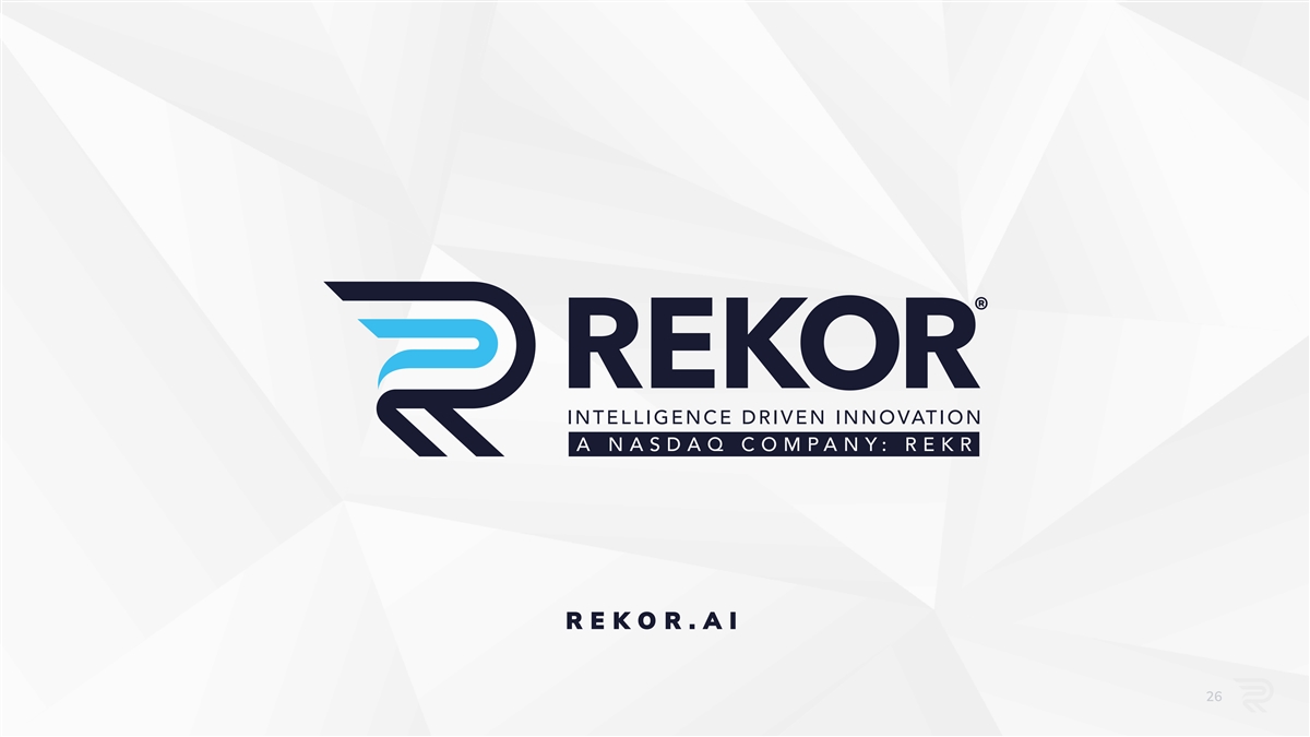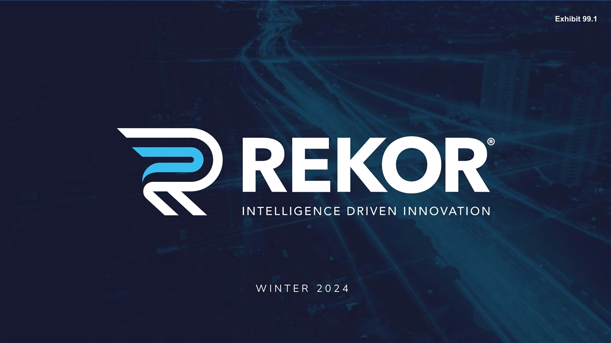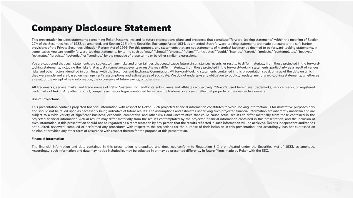 Company Disclosure Statement This presentation includes statements concerning Rekor Systems, Inc. and its future expectations, plans and prospects that constitute forward-looking statements within the meaning of Section 27A of the Securities Act of 1933, as amended, and Section 21E of the Securities Exchange Act of 1934, as amended. Such forward-looking statements are made pursuant to the safe harbor provisions of the Private Securities Litigation Reform Act of 1995. For this purpose, any statements that are not statements of historical fact may be deemed to be forward-looking statements. In some cases, you can identify forward-looking statements by terms such as may, should, expects, plans, anticipates, could, intends, target, projects, contemplates, believes, estimates, predicts, potential, or continue, by the negative of these terms or by other similar expressions. You are cautioned that such statements are subject to many risks and uncertainties that could cause future circumstances, events, or results to differ materially from those projected in the forward- looking statements, including the risks that actual circumstances, events or results may differ materially from those projected in the forward-looking statements, particularly as a result of various risks and other factors identified in our filings with the Securities and Exchange Commission. All forward-looking statements contained in this presentation speak only as of the date on which they were made and are based on management's assumptions and estimates as of such date. We do not undertake any obligation to publicly update any forward-looking statements, whether as a result of the receipt of new information, the occurrence of future events, or otherwise. All trademarks, service marks, and trade names of Rekor Systems, Inc., and/or its subsidiaries and affiliates (collectively, “Rekor”), used herein are trademarks, service marks, or registered trademarks of Rekor. Any other product, company names, or logos mentioned herein are the trademarks and/or intellectual property of their respective owners. Use of Projections This presentation contains projected financial information with respect to Rekor. Such projected financial information constitutes forward-looking information, is for illustrative purposes only and should not be relied upon as necessarily being indicative of future results. The assumptions and estimates underlying such projected financial information are inherently uncertain and are subject to a wide variety of significant business, economic, competitive and other risks and uncertainties that could cause actual results to differ materially from those contained in the projected financial information. Actual results may differ materially from the results contemplated by the projected financial information contained in this presentation, and the inclusion of such information in this presentation should not be regarded as a representation by any person that the results reflected in such information will be achieved. Rekor’s independent auditor has not audited, reviewed, compiled or performed any procedures with respect to the projections for the purpose of their inclusion in this presentation, and accordingly, has not expressed an opinion or provided any other form of assurance with respect thereto for the purpose of this presentation. Financial Information The financial information and data contained in this presentation is unaudited and does not conform to Regulation S-X promulgated under the Securities Act of 1933, as amended. Accordingly, such information and data may not be included in, may be adjusted in or may be presented differently in future filings made by Rekor with the SEC.