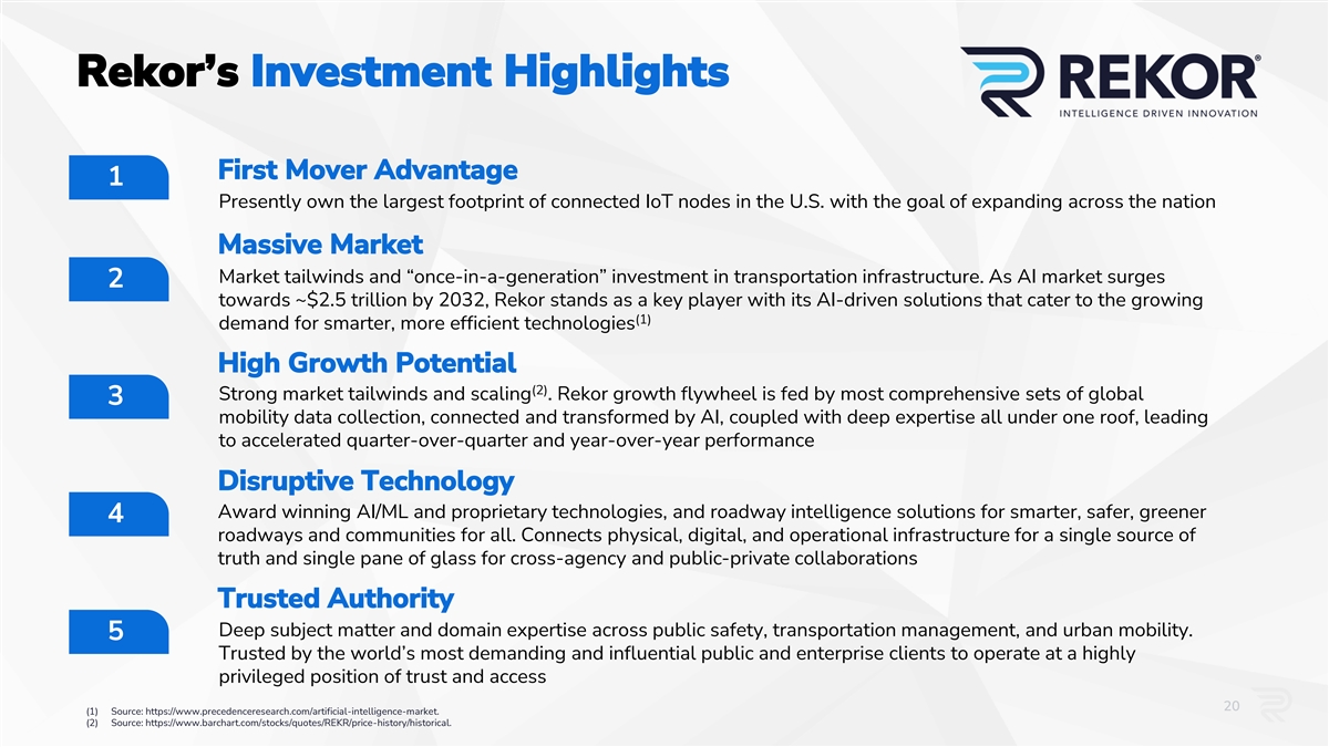 Rekor’s Investment Highlights First Mover Advantage 1 Presently own the largest footprint of connected IoT nodes in the U.S. with the goal of expanding across the nation Massive Market Market tailwinds and “once-in-a-generation” investment in transportation infrastructure. As AI market surges 2 towards ~$2.5 trillion by 2032, Rekor stands as a key player with its AI-driven solutions that cater to the growing (1) demand for smarter, more efficient technologies High Growth Potential (2) Strong market tailwinds and scaling . Rekor growth flywheel is fed by most comprehensive sets of global 3 mobility data collection, connected and transformed by AI, coupled with deep expertise all under one roof, leading to accelerated quarter-over-quarter and year-over-year performance Disruptive Technology Award winning AI/ML and proprietary technologies, and roadway intelligence solutions for smarter, safer, greener 4 roadways and communities for all. Connects physical, digital, and operational infrastructure for a single source of truth and single pane of glass for cross-agency and public-private collaborations Trusted Authority Deep subject matter and domain expertise across public safety, transportation management, and urban mobility. 5 Trusted by the world’s most demanding and influential public and enterprise clients to operate at a highly privileged position of trust and access (1) Source: https://www.precedenceresearch.com/artificial-intelligence-market. (2) Source: https://www.barchart.com/stocks/quotes/REKR/price-history/historical.