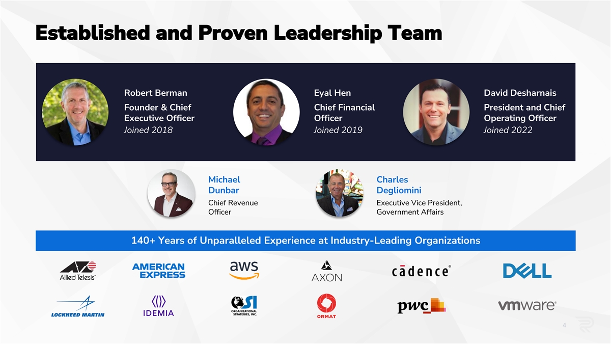 Established and Proven Leadership Team Robert Berman Eyal Hen David Desharnais Founder & Chief Chief Financial President and Chief Executive Officer Officer Operating Officer Joined 2018 Joined 2019 Joined 2022 Michael Charles Dunbar Degliomini Chief Revenue Executive Vice President, Officer Government Affairs 140+ Years of Unparalleled Experience at Industry-Leading Organizations