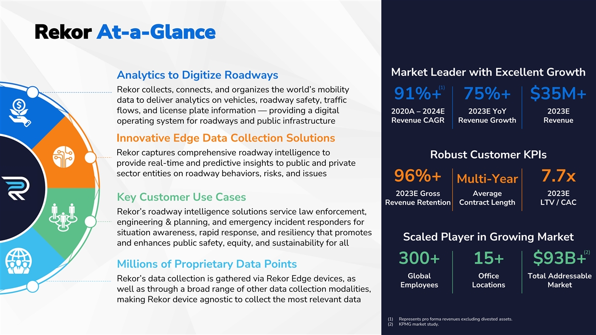 Rekor At-a-Glance Market Leader with Excellent Growth Analytics to Digitize Roadways (1) Rekor collects, connects, and organizes the world’s mobility 91%+ 75%+ $35M+ data to deliver analytics on vehicles, roadway safety, traffic flows, and license plate information — providing a digital 2020A – 2024E 2023E YoY 2023E Revenue CAGR Revenue Growth Revenue operating system for roadways and public infrastructure Innovative Edge Data Collection Solutions Rekor captures comprehensive roadway intelligence to Robust Customer KPIs provide real-time and predictive insights to public and private sector entities on roadway behaviors, risks, and issues 96%+ 7.7x Multi-Year 2023E Gross Average 2023E Key Customer Use Cases Revenue Retention Contract Length LTV / CAC Rekor’s roadway intelligence solutions service law enforcement, engineering & planning, and emergency incident responders for situation awareness, rapid response, and resiliency that promotes Scaled Player in Growing Market and enhances public safety, equity, and sustainability for all (2) 300+ 15+ $93B+ Millions of Proprietary Data Points Global Office Total Addressable Rekor’s data collection is gathered via Rekor Edge devices, as Employees Locations Market well as through a broad range of other data collection modalities, making Rekor device agnostic to collect the most relevant data (1) Represents pro forma revenues excluding divested assets. (2) KPMG market study.