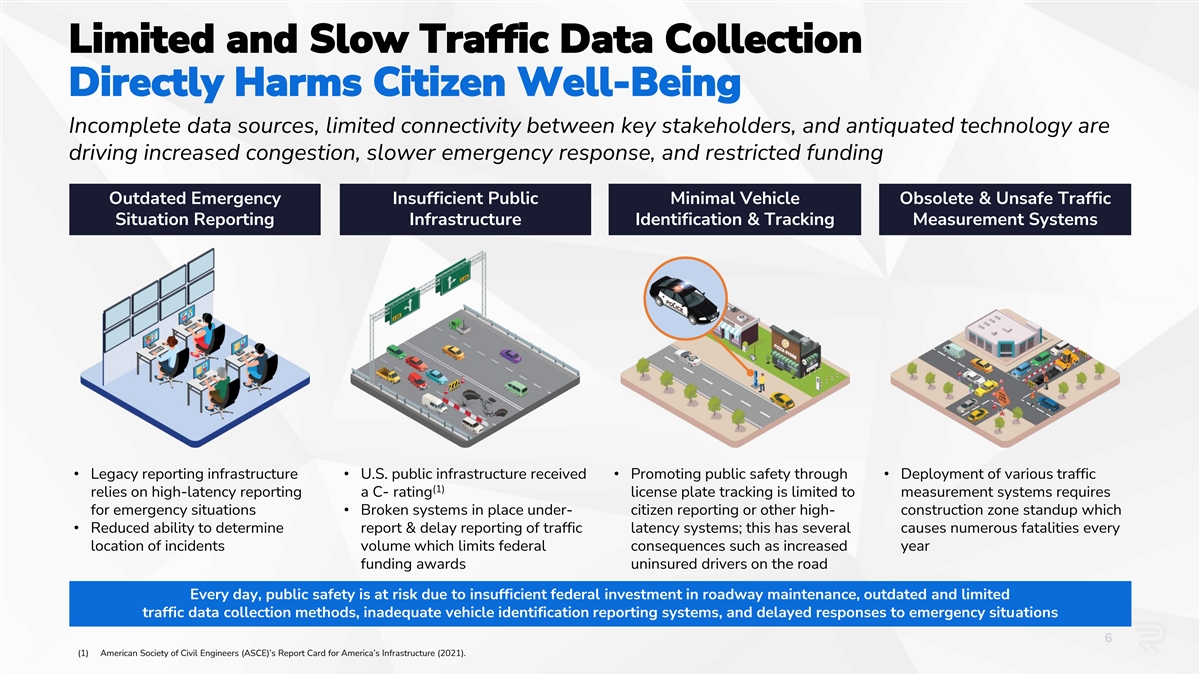 Limited and Slow Traffic Data Collection Directly Harms Citizen Well-Being Incomplete data sources, limited connectivity between key stakeholders, and antiquated technology are driving increased congestion, slower emergency response, and restricted funding Outdated Emergency Insufficient Public Minimal Vehicle Obsolete & Unsafe Traffic Situation Reporting Infrastructure Identification & Tracking Measurement Systems • Legacy reporting infrastructure • U.S. public infrastructure received • Promoting public safety through • Deployment of various traffic (1) relies on high-latency reporting a C- rating license plate tracking is limited to measurement systems requires for emergency situations• Broken systems in place under- citizen reporting or other high- construction zone standup which • Reduced ability to determine report & delay reporting of traffic latency systems; this has several causes numerous fatalities every location of incidents volume which limits federal consequences such as increased year funding awards uninsured drivers on the road Every day, public safety is at risk due to insufficient federal investment in roadway maintenance, outdated and limited traffic data collection methods, inadequate vehicle identification reporting systems, and delayed responses to emergency situations (1) American Society of Civil Engineers (ASCE)’s Report Card for America’s Infrastructure (2021).