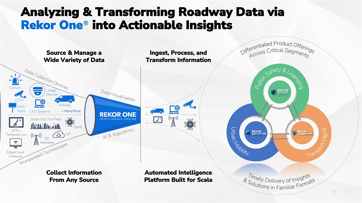 Analyzing & Transforming Roadway Data via Rekor One® into Actionable Insights Source & Manage a Ingest, Process, and Wide Variety of Data Transform Information Sensors Edge Devices CCTV Vehicles DMS Signs + Many More CAD Systems Smart City / GovTech AI/ML GPS + IoT Temporal Loc. 5G Networks Edge/Cloud Compute Collect Information Automated Intelligence From Any Source Platform Built for Scale