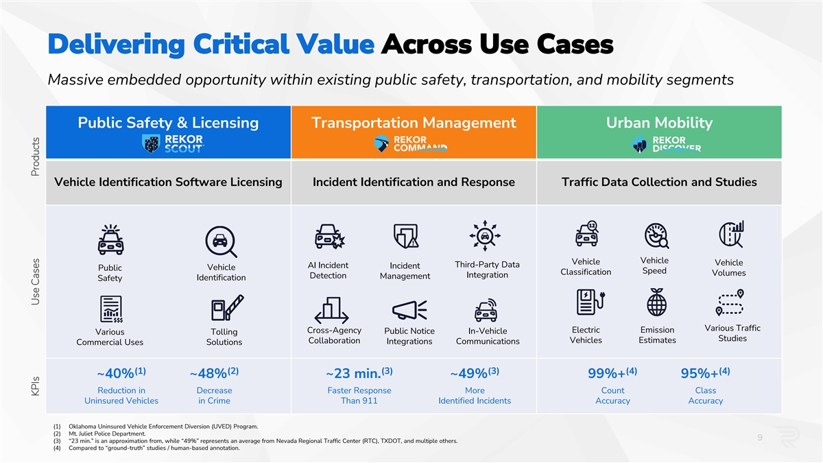 Delivering Critical Value Across Use Cases Massive embedded opportunity within existing public safety, transportation, and mobility segments Public Safety & Licensing Transportation Management Urban Mobility Vehicle Identification Software Licensing Incident Identification and Response Traffic Data Collection and Studies Vehicle Vehicle Vehicle Third-Party Data AI Incident Incident Vehicle Public Speed Classification Volumes Integration Detection Management Identification Safety Various Traffic Electric Emission Cross-Agency In-Vehicle Tolling Public Notice Various Studies Vehicles Estimates Collaboration Communications Solutions Integrations Commercial Uses (1) (2) (3) (3) (4) (4) ~40% ~48% ~23 min. ~49% 99%+ 95%+ Reduction in Decrease Faster Response More Count Class Uninsured Vehicles in Crime Than 911 Identified Incidents Accuracy Accuracy (1) Oklahoma Uninsured Vehicle Enforcement Diversion (UVED) Program. (2) Mt. Juliet Police Department. (3) “23 min.” is an approximation from, while “49%” represents an average from Nevada Regional Traffic Center (RTC), TXDOT, and multiple others. (4) Compared to “ground-truth” studies / human-based annotation. KPIs Use Cases Products
