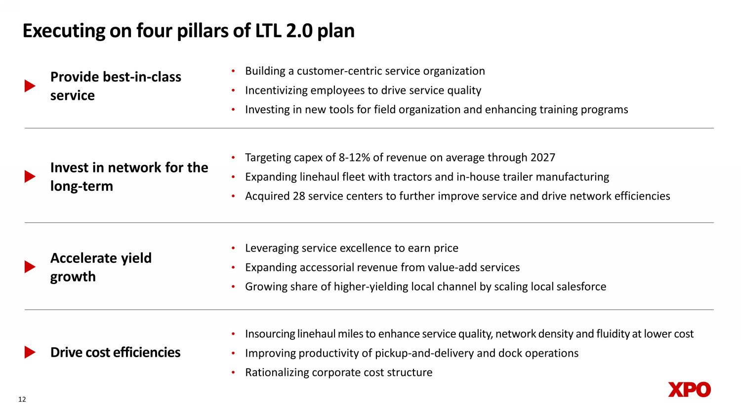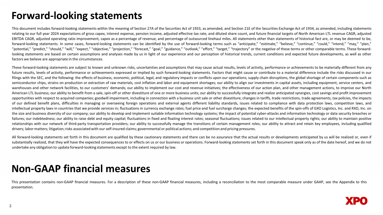 2 Forward - looking statements This document includes forward - looking statements within the meaning of Section 27 A of the Securities Act of 1933 , as amended, and Section 21 E of the Securities Exchange Act of 1934 , as amended, including statements relating to our full year 2024 expectations of gross capex, interest expense, pension income, adjusted effective tax rate, and diluted share count, and future financial targets of North American LTL revenue CAGR, adjusted EBITDA CAGR, adjusted operating ratio improvement, capex as a percentage of revenue, and percentage of outsourced linehaul miles . All statements other than statements of historical fact are, or may be deemed to be, forward - looking statements . In some cases, forward - looking statements can be identified by the use of forward - looking terms such as “anticipate,” “estimate,” “believe,” “continue,” “could,” “intend,” “may,” “plan,” “potential,” “predict,” “should,” “will,” “expect,” “objective,” “projection,” “forecast,” “goal,” “guidance,” “outlook,” “effort,” “target,” “trajectory” or the negative of these terms or other comparable terms . These forward - looking statements are based on certain assumptions and analyses made by us in light of our experience and our perception of historical trends, current conditions and expected future developments, as well as other factors we believe are appropriate in the circumstances . These forward - looking statements are subject to known and unknown risks, uncertainties and assumptions that may cause actual results, levels of activity, performance or achievements to be materially different from any future results, levels of activity, performance or achievements expressed or implied by such forward - looking statements . Factors that might cause or contribute to a material difference include the risks discussed in our filings with the SEC, and the following : the effects of business, economic, political, legal, and regulatory impacts or conflicts upon our operations ; supply chain disruptions, the global shortage of certain components such as semiconductor chips, strains on production or extraction of raw materials, cost inflation and labor and equipment shortages ; our ability to align our investments in capital assets, including equipment, service centers, and warehouses and other network facilities, to our customers’ demands ; our ability to implement our cost and revenue initiatives ; the effectiveness of our action plan, and other management actions, to improve our North American LTL business ; our ability to benefit from a sale, spin - off or other divestiture of one or more business units ; our ability to successfully integrate and realize anticipated synergies, cost savings and profit improvement opportunities with respect to acquired companies ; goodwill impairment, including in connection with a business unit sale or other divestiture ; changes in tariffs, trade restrictions, trade agreements, tax policies, the impacts of our defined benefit plans, difficulties in managing or overseeing foreign operations and external agents different liability standards, issues related to compliance with data protection laws, competition laws, and intellectual property laws in countries that we provide services in ; fluctuations in currency exchange rates ; fuel price and fuel surcharge changes ; the expected benefits of the spin - offs of GXO Logistics, Inc . and RXO, Inc . on the size and business diversity of our company ; our ability to develop and implement suitable information technology systems ; the impact of potential cyber - attacks and information technology or data security breaches or failures ; our indebtedness ; our ability to raise debt and equity capital ; fluctuations in fixed and floating interest rates ; seasonal fluctuations ; issues related to our intellectual property rights ; our ability to maintain positive relationships with our network of third - party transportation providers ; our ability to successfully manage the transitions of certain management roles ; our ability to attract and retain key employees, including qualified drivers ; labor matters ; litigation ; risks associated with our self - insured claims ; governmental or political actions ; and competition and pricing pressures . All forward - looking statements set forth in this document are qualified by these cautionary statements and there can be no assurance that the actual results or developments anticipated by us will be realized or, even if substantially realized, that they will have the expected consequences to or effects on us or our business or operations . Forward - looking statements set forth in this document speak only as of the date hereof, and we do not undertake any obligation to update forward - looking statements except to the extent required by law . Non - GAAP financial measures This presentation contains non - GAAP financial measures . For a description of these non - GAAP financial measures, including a reconciliation to the most comparable measure under GAAP, see the Appendix to this presentation .