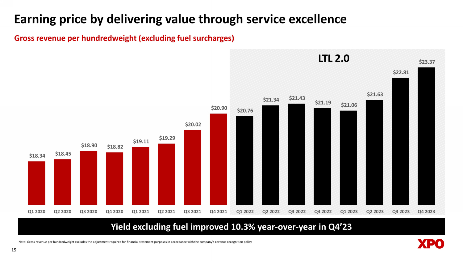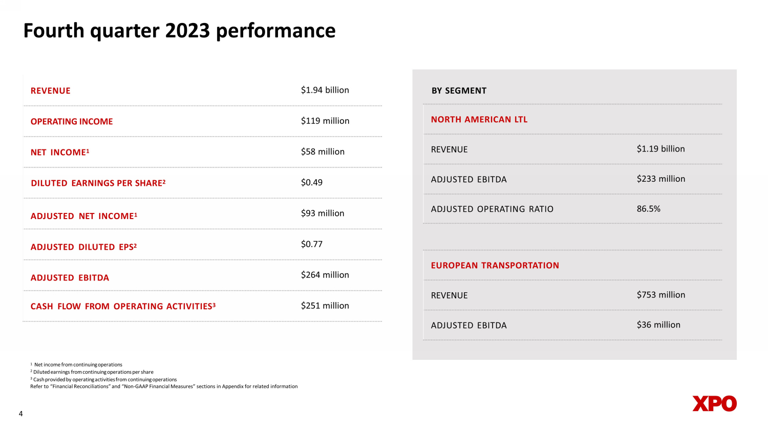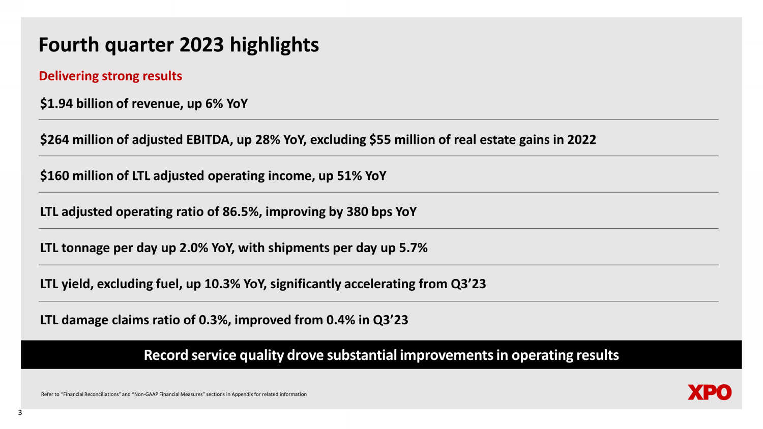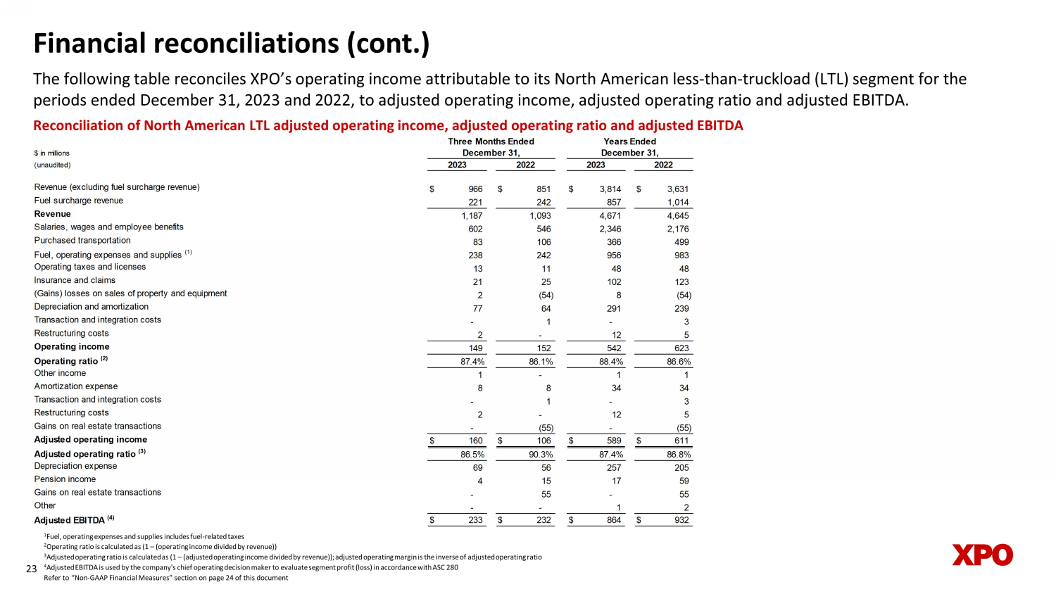 Financial reconciliations (cont.) The following table reconciles XPO’s operating income attributable to its North American less - than - truckload (LTL) segment for t he periods ended December 31, 2023 and 2022, to adjusted operating income, adjusted operating ratio and adjusted EBITDA. 23 Reconciliation of N orth American LTL adjusted operating income, adjusted operating ratio and adjusted EBITDA 1 Fuel, operating expenses and supplies includes fuel - related taxes 2 Operating ratio is calculated as (1 – (operating income divided by revenue)) 3 Adjusted operating ratio is calculated as (1 – (adjusted operating income divided by revenue)); adjusted operating margin is the inverse of adjusted operating ratio 4 Adjusted EBITDA is used by the company's chief operating decision maker to evaluate segment profit (loss) in accordance with ASC 280 Refer to “Non - GAAP Financial Measures” section on page 24 of this document $ in millions (unaudited) Revenue (excluding fuel surcharge revenue) $ 966 $ 851 $ 3,814 $ 3,631 Fuel surcharge revenue 221 242 857 1,014 Revenue 1,187 1,093 4,671 4,645 Salaries, wages and employee benefits 602 546 2,346 2,176 Purchased transportation 83 106 366 499 Fuel, operating expenses and supplies (1) 238 242 956 983 Operating taxes and licenses 13 11 48 48 Insurance and claims 21 25 102 123 (Gains) losses on sales of property and equipment 2 (54) 8 (54) Depreciation and amortization 77 64 291 239 Transaction and integration costs - 1 - 3 Restructuring costs 2 - 12 5 Operating income 149 152 542 623 Operating ratio (2) 87.4% 86.1% 88.4% 86.6% Other income 1 - 1 1 Amortization expense 8 8 34 34 Transaction and integration costs - 1 - 3 Restructuring costs 2 - 12 5 Gains on real estate transactions - (55) - (55) Adjusted operating income $ 160 $ 106 $ 589 $ 611 Adjusted operating ratio (3) 86.5% 90.3% 87.4% 86.8% Depreciation expense 69 56 257 205 Pension income 4 15 17 59 Gains on real estate transactions - 55 - 55 Other - - 1 2 Adjusted EBITDA (4) $ 233 $ 232 $ 864 $ 932 Years Ended December 31, 2023 20222023 2022 Three Months Ended December 31,