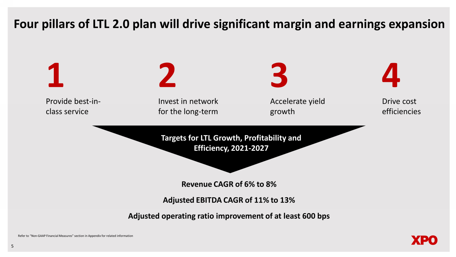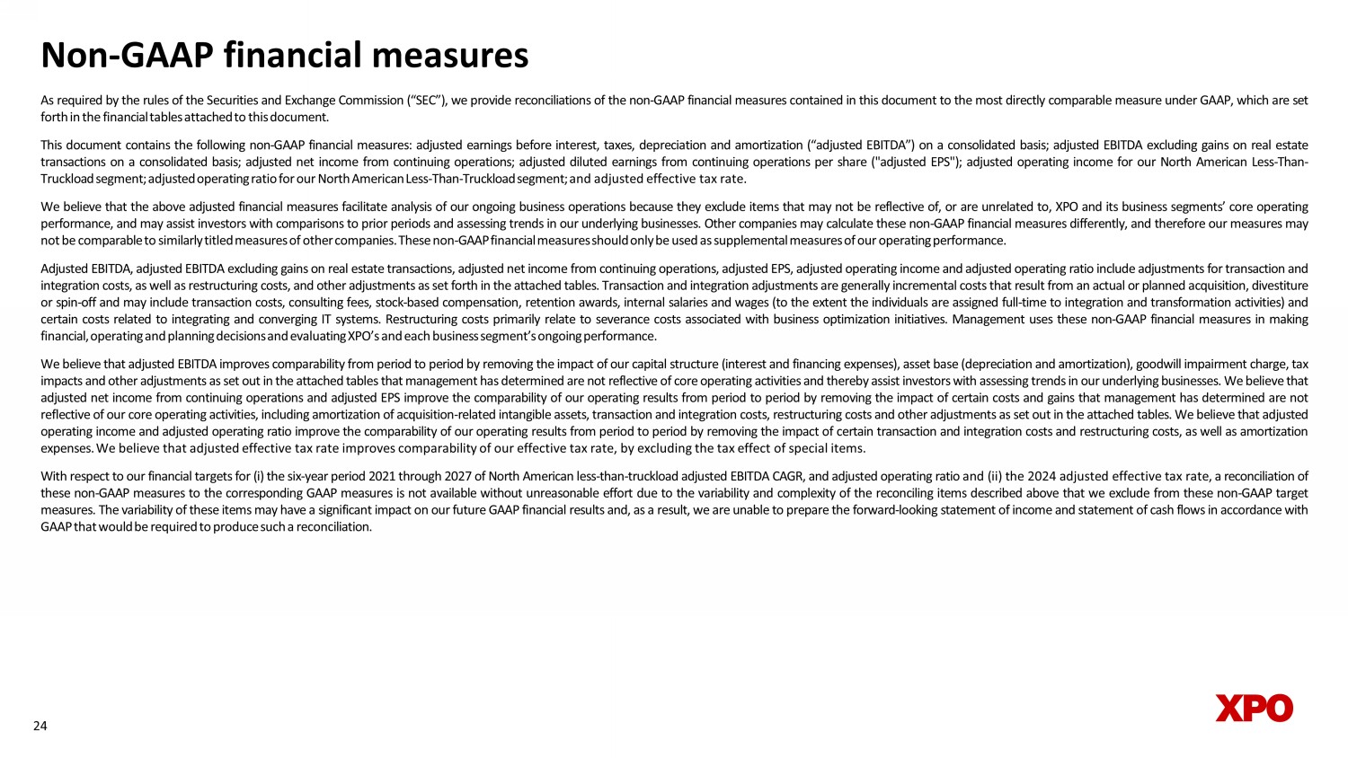 Non - GAAP financial measures As required by the rules of the Securities and Exchange Commission (“SEC”), we provide reconciliations of the non - GAAP financial measures contained in this document to the most directly comparable measure under GAAP, which are set forth in the financial tables attached to this document . This document contains the following non - GAAP financial measures : adjusted earnings before interest, taxes, depreciation and amortization (“adjusted EBITDA”) on a consolidated basis ; adjusted EBITDA excluding gains on real estate transactions on a consolidated basis ; adjusted net income from continuing operations ; adjusted diluted earnings from continuing operations per share ("adjusted EPS") ; adjusted operating income for our North American Less - Than - Truckload segment ; and adjusted operating ratio for our North American Less - Than - Truckload segment . We believe that the above adjusted financial measures facilitate analysis of our ongoing business operations because they exclude items that may not be reflective of, or are unrelated to, XPO and its business segments’ core operating performance, and may assist investors with comparisons to prior periods and assessing trends in our underlying businesses . Other companies may calculate these non - GAAP financial measures differently, and therefore our measures may not be comparable to similarly titled measures of other companies . These non - GAAP financial measures should only be used as supplemental measures of our operating performance . Adjusted EBITDA, adjusted EBITDA excluding gains on real estate transactions, adjusted net income from continuing operations, adjusted EPS, adjusted operating income and adjusted operating ratio include adjustments for transaction and integration costs, as well as restructuring costs, and other adjustments as set forth in the attached tables . Transaction and integration adjustments are generally incremental costs that result from an actual or planned acquisition, divestiture or spin - off and may include transaction costs, consulting fees, stock - based compensation, retention awards, internal salaries and wages (to the extent the individuals are assigned full - time to integration and transformation activities) and certain costs related to integrating and converging IT systems . Restructuring costs primarily relate to severance costs associated with business optimization initiatives . Management uses these non - GAAP financial measures in making financial, operating and planning decisions and evaluating XPO’s and each business segment’s ongoing performance . We believe that adjusted EBITDA improves comparability from period to period by removing the impact of our capital structure (interest and financing expenses), asset base (depreciation and amortization), goodwill impairment charge, tax impacts and other adjustments as set out in the attached tables that management has determined are not reflective of core operating activities and thereby assist investors with assessing trends in our underlying businesses . We believe that adjusted net income from continuing operations and adjusted EPS improve the comparability of our operating results from period to period by removing the impact of certain costs and gains that management has determined are not reflective of our core operating activities, including amortization of acquisition - related intangible assets, transaction and integration costs, restructuring costs and other adjustments as set out in the attached tables . We believe that adjusted operating income and adjusted operating ratio improve the comparability of our operating results from period to period by removing the impact of certain transaction and integration costs and restructuring costs, as well as amortization expenses . With respect to our financial targets for the six - year period 2021 through 2027 of North American less - than - truckload adjusted EBITDA CAGR, and adjusted operating ratio, a reconciliation of these non - GAAP measures to the corresponding GAAP measures is not available without unreasonable effort due to the variability and complexity of the reconciling items described above that we exclude from these non - GAAP target measures . The variability of these items may have a significant impact on our future GAAP financial results and, as a result, we are unable to prepare the forward - looking statement of income and statement of cash flows in accordance with GAAP that would be required to produce such a reconciliation . 24