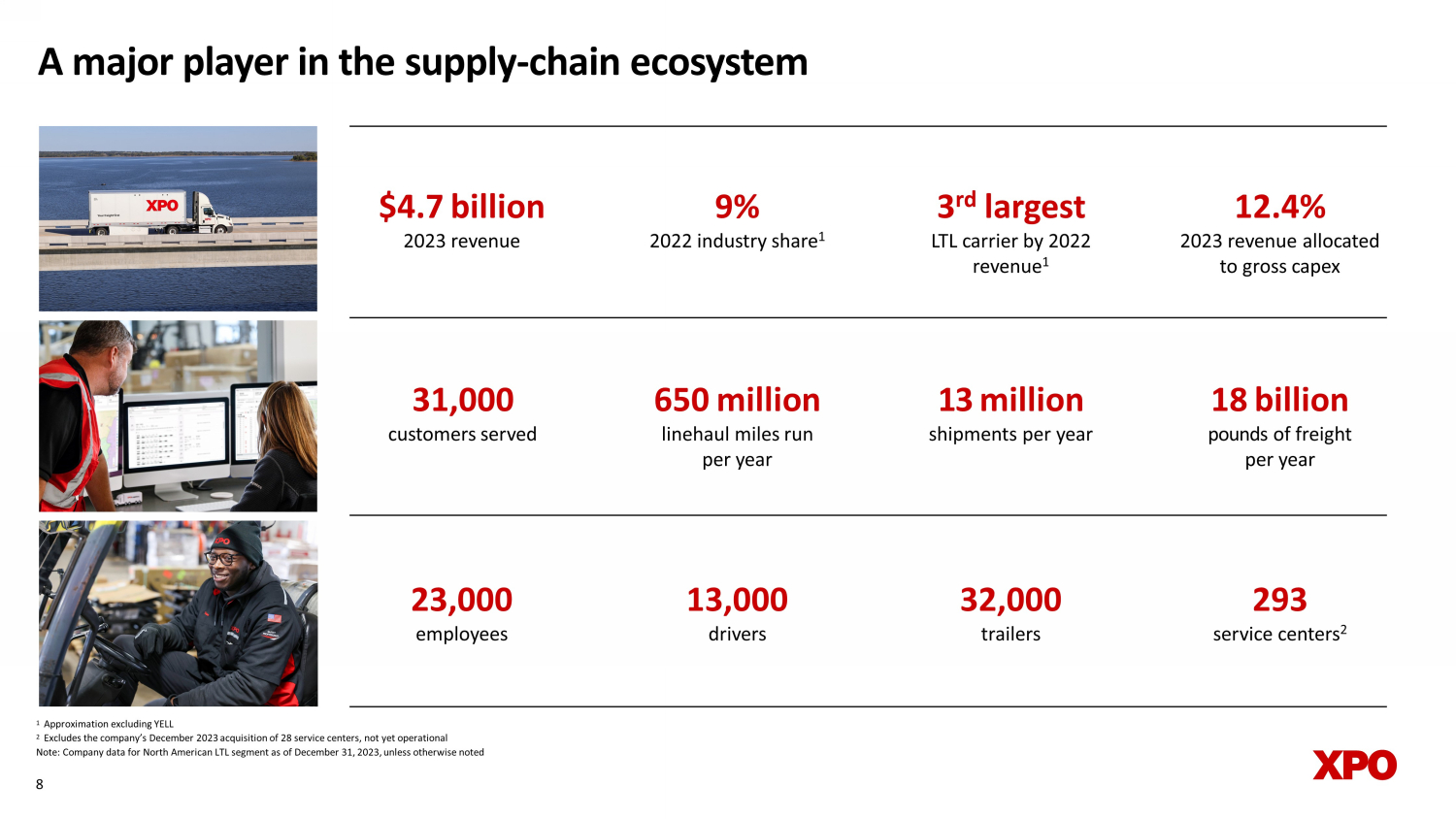 A major player in the supply - chain ecosystem 1 Approximation excluding YELL 2 Excludes the company’s December 2023 acquisition of 28 service centers, not yet operational Note: Company data for North American LTL segment as of December 31, 2023, unless otherwise noted 3 rd largest LTL carrier by 2022 revenue 1 12.4% 2023 revenue allocated to gross capex 13 million s hipments per year 31 ,000 customers served $4.7 billion 2023 revenue 9 % 2022 industry share 1 8 13,0 0 0 d rivers 32 ,0 0 0 t railers 18 billion pounds of freight per year 6 5 0 million l inehaul miles run per year 2 3 ,0 0 0 e mployees 293 service centers 2 quarterly (bring back