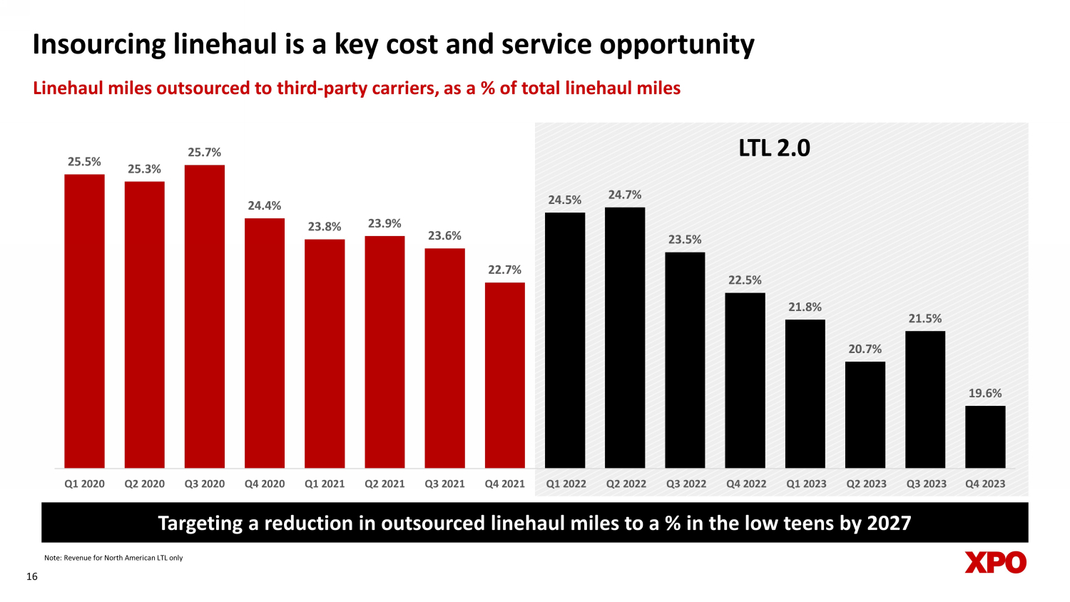 Insourcing linehaul is a key cost and service opportunity 16 Targeting a reduction in outsourced linehaul miles to a % in the low teens by 2027 Note: R evenue for North American LTL only 25.5% 25.3% 25.7% 24.4% 23.8% 23.9% 23.6% 22.7% 24.5% 24.7% 23.5% 22.5% 21.8% 20.7% 21.5% 19.6% Q1 2020 Q2 2020 Q3 2020 Q4 2020 Q1 2021 Q2 2021 Q3 2021 Q4 2021 Q1 2022 Q2 2022 Q3 2022 Q4 2022 Q1 2023 Q2 2023 Q3 2023 Q4 2023 LTL 2.0 Linehaul miles outsourced to third - party carriers, as a % of total linehaul miles