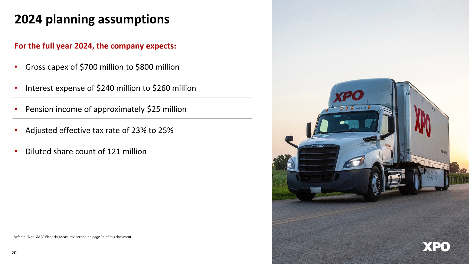 Financial reconciliations (cont.) The following table reconciles XPO’s net income (loss) from continuing operations for the periods ended December 31, 2023 and 20 22, to adjusted net income from continuing operations for the same periods. 22 1 Relates to California Environmental Matters as described in Note 9 to the Company's third quarter Form 10 - Q 2 The income tax rate applied to reconciling items is based on the GAAP annual effective tax rate, excluding discrete items, no n - d eductible compensation, and contribution - and margin - based taxes Refer to “Non - GAAP Financial Measures” section on page 24 of this document Reconciliation of adjusted net income and adjusted diluted earnings per share $ in millions, except per-share data (unaudited) Net income (loss) from continuing operations $ 58 $ (36) $ 192 $ 184 Debt extinguishment loss 2 13 25 39 Amortization of acquisition-related intangible assets 13 14 55 54 Goodwill impairment - 64 - 64 Litigation matter (1) 8 - 8 - Transaction and integration costs 11 42 58 58 Restructuring costs 9 35 44 50 Income tax associated with the adjustments above (2) (8) (19) (36) (41) Adjusted net income from continuing operations attributable to common shareholders $ 93 $ 113 $ 346 $ 408 Adjusted diluted earnings from continuing operations per share $ 0.77 $ 0.98 $ 2.92 $ 3.53 Weighted-average common shares outstanding Diluted weighted-average common shares outstanding 120 115 118 116 Incremental dilutive effect of stock-based awards - 1 - - Adjusted diluted weighted-average common shares outstanding 120 116 118 116 Three Months Ended Years Ended December 31, December 31, 2023 2022 2023 2022