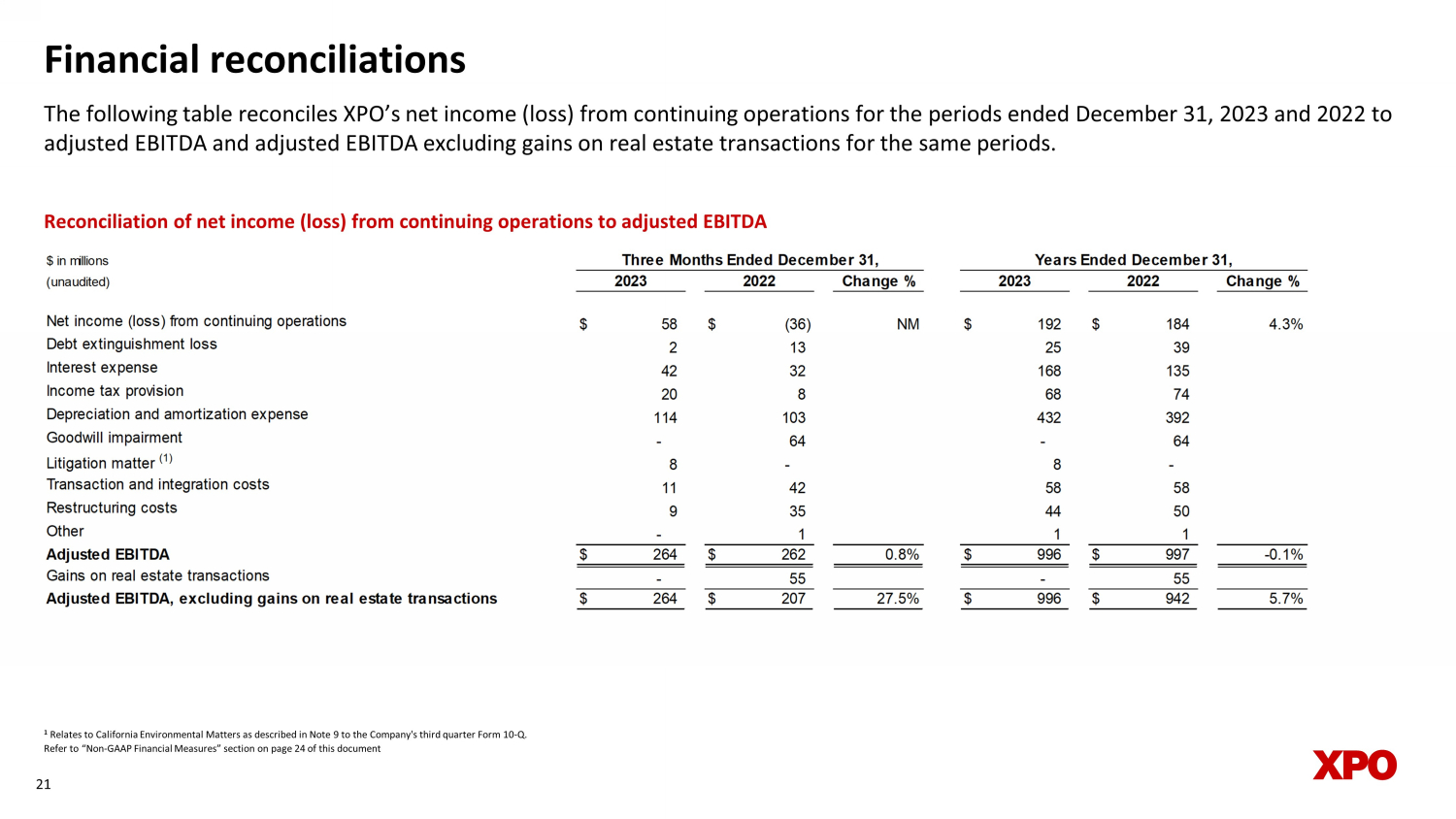 Financial reconciliations The following table reconciles XPO’s net income (loss) from continuing operations for the periods ended December 31, 2023 and 20 22 to adjusted EBITDA and adjusted EBITDA excluding gains on real estate transactions for the same periods. 21 Reconciliation of net income (loss) from continuing operations to adjusted EBITDA 1 Relates to California Environmental Matters as described in Note 9 to the Company's third quarter Form 10 - Q. Refer to “Non - GAAP Financial Measures” section on page 24 of this document $ in millions (unaudited) Change % Change % Net income (loss) from continuing operations $ 58 $ (36) NM $ 192 $ 184 4.3% Debt extinguishment loss 2 13 25 39 Interest expense 42 32 168 135 Income tax provision 20 8 68 74 Depreciation and amortization expense 114 103 432 392 Goodwill impairment - 64 - 64 Litigation matter (1) 8 - 8 - Transaction and integration costs 11 42 58 58 Restructuring costs 9 35 44 50 Other - 1 1 1 Adjusted EBITDA $ 264 $ 262 0.8% $ 996 $ 997 -0.1% Gains on real estate transactions - 55 - 55 Adjusted EBITDA, excluding gains on real estate transactions $ 264 $ 207 27.5% $ 996 $ 942 5.7% Three Months Ended December 31, Years Ended December 31, 2023 2022 2023 2022