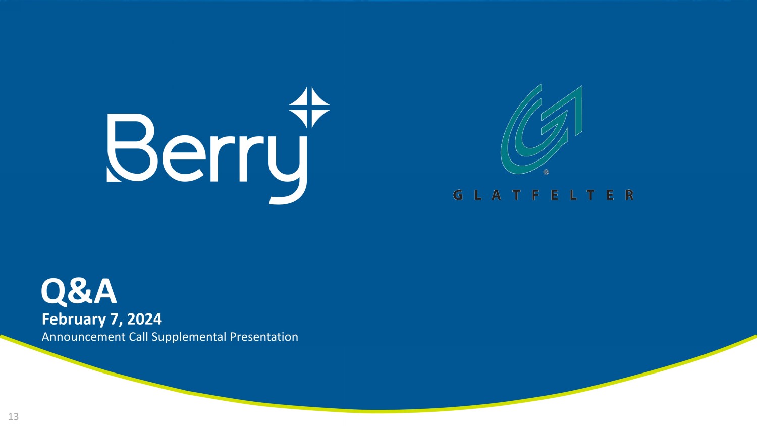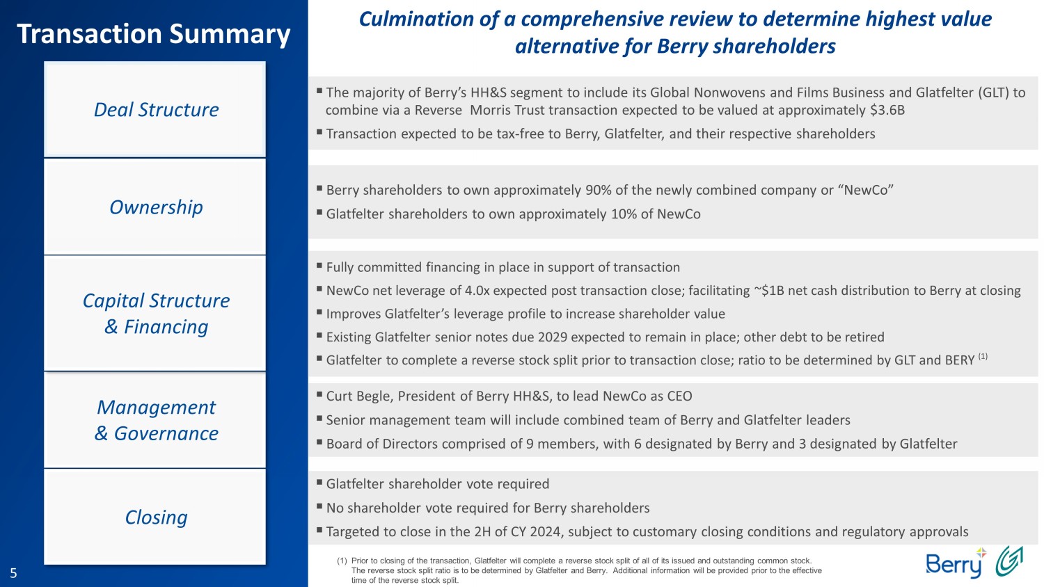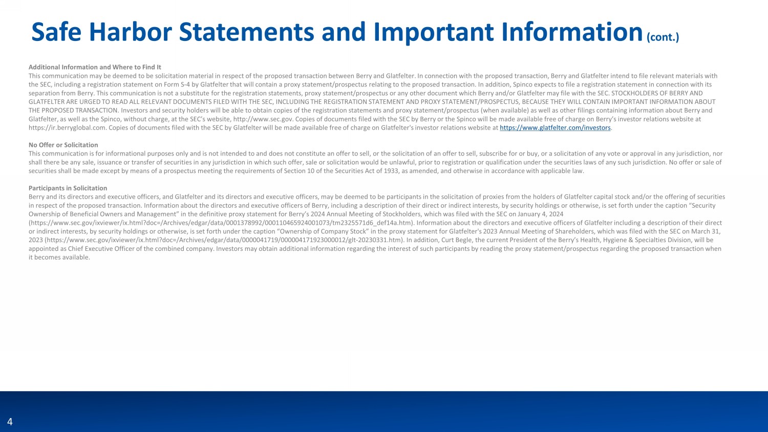 This communication may be deemed to be solicitation material in respect of the proposed transaction between Berry and Glatfelter. In connection with the proposed transaction, Berry and Glatfelter intend to file relevant materials with the SEC, including a registration statement on Form S-4 by Glatfelter that will contain a proxy statement/prospectus relating to the proposed transaction. In addition, Spinco expects to file a registration statement in connection with its separation from Berry. This communication is not a substitute for the registration statements, proxy statement/prospectus or any other document which Berry and/or Glatfelter may file with the SEC. STOCKHOLDERS OF BERRY AND GLATFELTER ARE URGED TO READ ALL RELEVANT DOCUMENTS FILED WITH THE SEC, INCLUDING THE REGISTRATION STATEMENT AND PROXY STATEMENT/PROSPECTUS, BECAUSE THEY WILL CONTAIN IMPORTANT INFORMATION ABOUT THE PROPOSED TRANSACTION. Investors and security holders will be able to obtain copies of the registration statements and proxy statement/prospectus (when available) as well as other filings containing information about Berry and Glatfelter, as well as the Spinco, without charge, at the SEC’s website, http://www.sec.gov. Copies of documents filed with the SEC by Berry or the Spinco will be made available free of charge on Berry’s investor relations website at https://ir.berryglobal.com. Copies of documents filed with the SEC by Glatfelter will be made available free of charge on Glatfelter's investor relations website at https://www.glatfelter.com/investors.